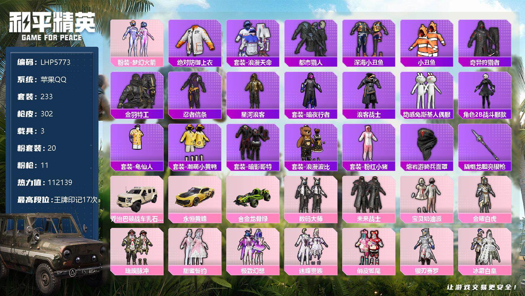- [13867575]安卓 手Q-35粉装-13特效枪-7载具-7粉色飞行器-130232热力值-27王牌印记-242套装-278枪皮 【红色载具】:路特斯ELETRE(电光紫)(二级) 【热门品类】:粉装-梦幻火箭,粉装-缤纷油彩,套装-浪漫天命,套装-动感兔斯基人偶服,套装-龟仙人,套装-潮萌小黄鸭,套装-浪漫波比,套装-粉红小猪 【粉色载具】:特斯拉Model X(珍珠白),路特斯ELETRE(电光紫),玛莎拉蒂Ghibli(金),玛莎拉蒂Ghibli(粉),迈凯伦570S(天际蓝),合金龙骨(绿),双人摩托-梦幻火箭,空客H135-蔚蓝之翼 【粉色套装】:粉装-宝贝奶油派,粉装-天使彩虹糖,粉装-蝶舞迷情,粉装-梦幻火箭,粉装-天启纪元,粉装-星之信仰,粉装-金风玉露,粉装-金属狂野,粉装-缤纷油彩,粉装-极致幻想,粉装-幻彩马卡龙,粉装-冰霜白皇,粉装-炙焰红王,粉装-香水柠檬,粉装-烈焰拳霸,粉装-枪炮玫瑰,粉装-蜜桃特工,粉装-蝶舞蔷薇,角色-闪耀迪迦,角色-赛罗闪耀型,粉装-彩虹鹿灵,粉装-甜心娃娃,粉装-精灵娃娃,粉装-酣梦娃娃,粉装-薄荷物语,粉装-恐龙拽拽,粉装-橘柚倾心,粉装-冷魅冰骑,粉装-赤焰黑爵,粉装-紫电风暴,粉装-甜梦小狐,粉装-圣光天使,粉装-妙趣可丽,粉装-霞光圣骑,粉装-寒光使者 【粉色枪皮等级】:AKM-炫紫旋律(五级),SCAR-L-童趣迷兔(七级),M416-心之恋语(七级),GROZA-香水柠檬(七级),AUG-妙趣可丽(七级),M762-冷魅冰骑(五级),UZI-绮梦青鸾(四级),UMP45-相思残雪(四级),Kar98K-巳巳如意(五级),M24-星之信仰(五级),AWM-橘柚倾心(四级),VSS-烈焰拳霸(四级),DP-28-扶摇飞仙(四级) 【粉色枪皮】:AKM-炫紫旋律,SCAR-L-童趣迷兔,M416-心之恋语,GROZA-香水柠檬,AUG-妙趣可丽,M762-冷魅冰骑,UZI-绮梦青鸾,UMP45-相思残雪,Kar98K-巳巳如意,M24-星之信仰,AWM-橘柚倾心,VSS-烈焰拳霸,DP-28-扶摇飞仙 【粉色飞行器】:春暖花开飞行器,梦幻火箭飞行器,炫紫旋律飞行器,神秘黑猫飞行器,绮梦青鸾飞行器,冷魅冰骑飞行器 【粉色降落伞】:深海曼妙降落伞,快乐主宰降落伞,凝视深渊降落伞,春暖花开降落伞,天启纪元降落伞,星之信仰降落伞