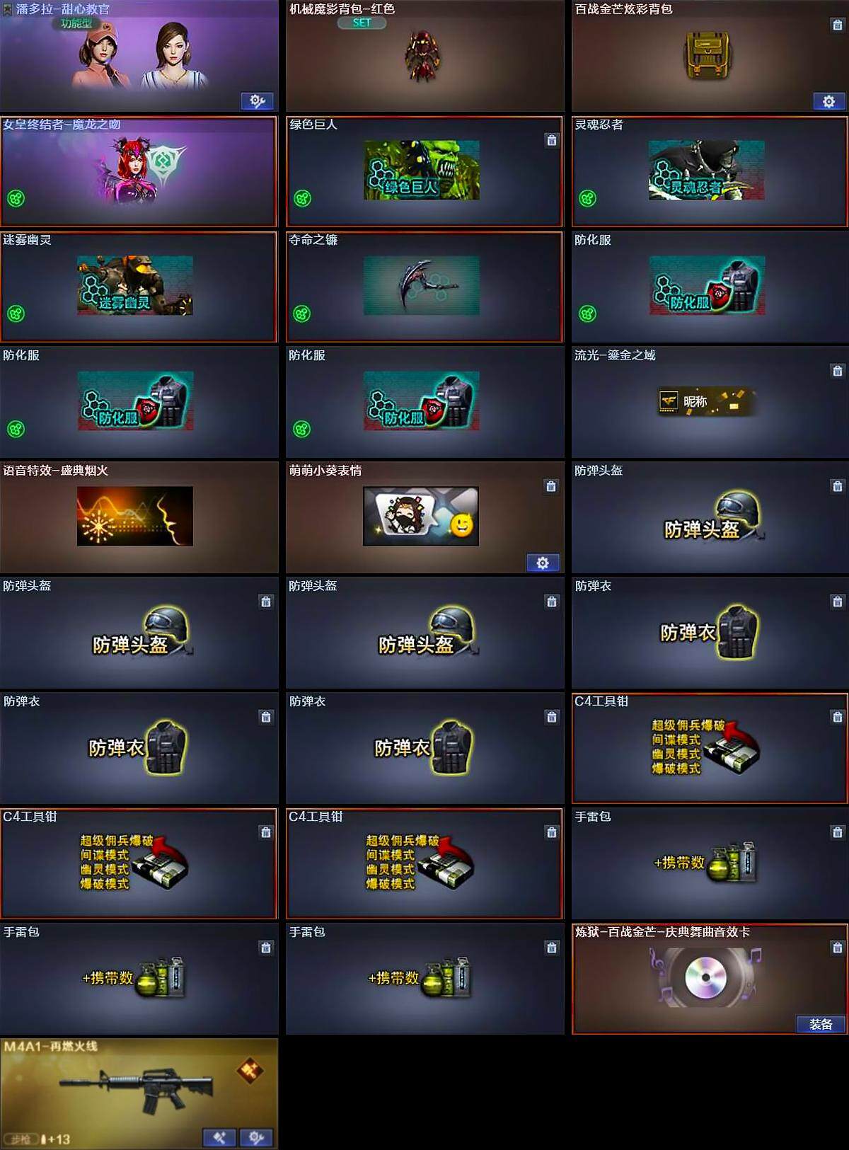 【道具】:机械魔影背包-红色,百战金芒炫彩背包,女皇终结者-魔龙之吻,绿色巨人,灵魂忍者,迷雾幽灵,夺命之镰,防化服*3,流光-鎏金之域,语音特效-盛典烟火,萌萌小葵表情,防弹头盔*3,防弹衣*3,C4工具钳*3,手雷包*3