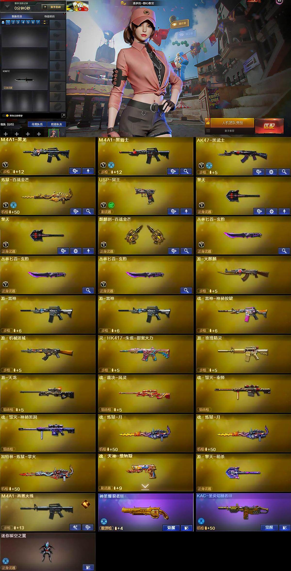 【英雄级武器】:M4A1-黑龙,M4A1-黑骑士,AK47-黑武士,炼狱-百战金芒,USP-冥王,擎天*2,麒麟刺-百战金芒,丛林匕首-玄豹*3