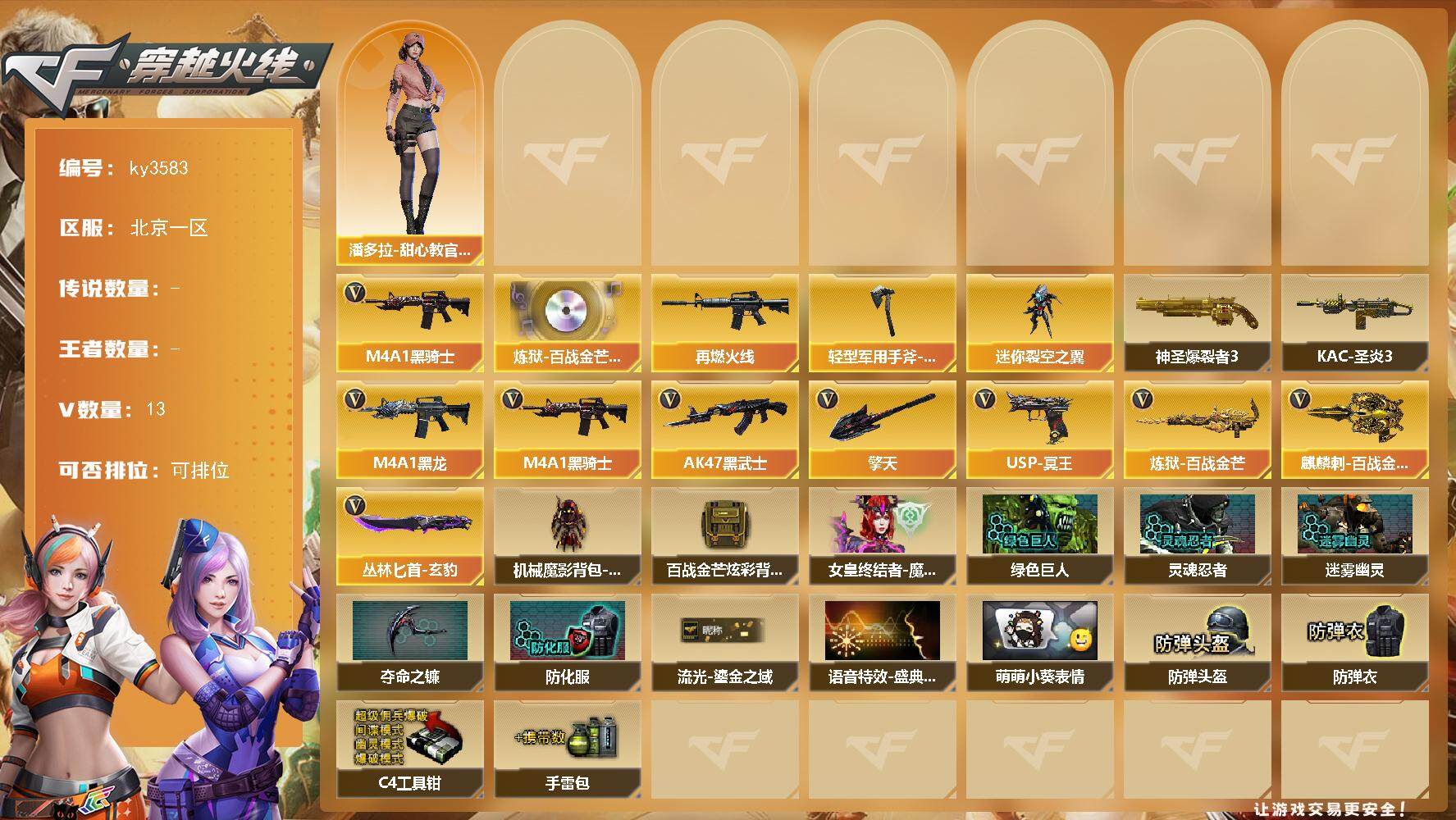 [13852570]北京一区-13V-0王者-0炫金 【热门武器】:M4A1-黑骑士 【音效卡】:炼狱-百战金芒-庆典舞曲音效卡 【皮肤】:M4A1-再燃火线,轻型军用手斧-再燃火线 【角色】:潘多拉-甜心教官 【人偶武器】:迷你裂空之翼 【挑战大师】:神圣爆裂者III,KAC-圣炎切割者III 【英雄级武器】:M4A1-黑龙,M4A1-黑骑士,AK47-黑武士,炼狱-百战金芒,USP-冥王,擎天*2,麒麟刺-百战金芒,丛林匕首-玄豹*3 【道具】:机械魔影背包-红色,百战金芒炫彩背包,女皇终结者-魔龙之吻,绿色巨人,灵魂忍者,迷雾幽灵,夺命之镰,防化服*3,流光-鎏金之域,语音特效-盛典烟火,萌萌小葵表情,防弹头盔*3,防弹衣*3,C4工具钳*3,手雷包*3 【特殊枪械】:1黑骑士