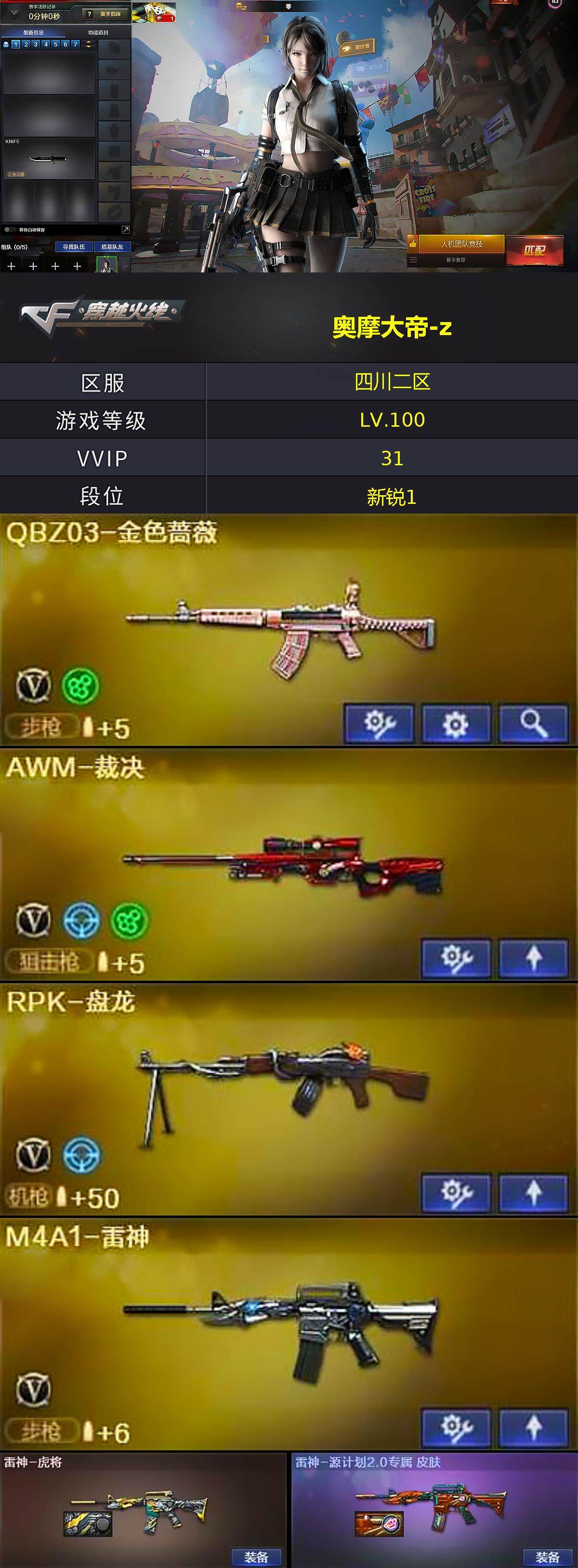 [13854130]四川二区-31V-1王者-0炫金 【热门武器】:QBZ03-金色蔷薇,RPK-盘龙,加特林-炼狱,沙鹰-修罗*2 【王者炫金武器】:王者之怒 【皮肤】:雷神-虎将,雷神-源计划2.0专属 皮肤,火麒麟-战神关羽,M4A1-千变-孔明皮肤,Barrett-金色蔷薇-蛇姬 皮肤,龙啸-蛇姬 皮肤 【角色】:零,樱,修道士,北极狐-X,电竞少女,风暴女,虎妞,兰-海滩派对,0号玩家,灵狐者-X,灵狐者-黄金海岸,龙儿,蛇姬 【人偶武器】:迷你深渊冰龙,迷你牛魔王,生化手雷-机甲核心*2,深渊终结者手雷 【暴走生化】:超级对讲机 【挑战大师】:AK47-冰龙粉碎者,激光毁灭者III,神圣爆裂者-末日III 【英雄级武器】:AK47-火麒麟,AK47-麒麟,M4A1-雷神,M4A1-玫瑰精灵,QBZ03-金色蔷薇,M4A1-猎神,黑骑士-海王,AWM-裁决,RPK-盘龙,加特林-炼狱,AA-12-雷霆,沙鹰-修罗*2,屠龙*4,龙啸,麒麟刺-堕天神,龙啸-堕天神,高爆手雷-堕天神*2,闪光弹-堕天神*2,烟雾弹-堕天神*3,M4A1-赤狱骑士 【道具】:CFS限定背包,冰冰企鹅背包,超级背包,迷你冰龙背包,黄金曼提柯尔的背包,女皇终结者-魔龙之吻,救世主-黑桃战神,绿色巨人,灵魂忍者*2,变异宝贝,妖姬,迷雾幽灵*2,生化弹匣,夺命之镰,防化服*3,金色流光-枪王排位*2,星辰流光-枪王排位,流光-再燃火线,枪王排位28赛季金色流光,EP战队名片,EP战队喷图,EP战队击杀图标,C4-沙漠,防弹头盔*5,防弹衣*5,C4工具钳*4,手雷包*5 【特殊枪械】:1盘龙,1炼狱