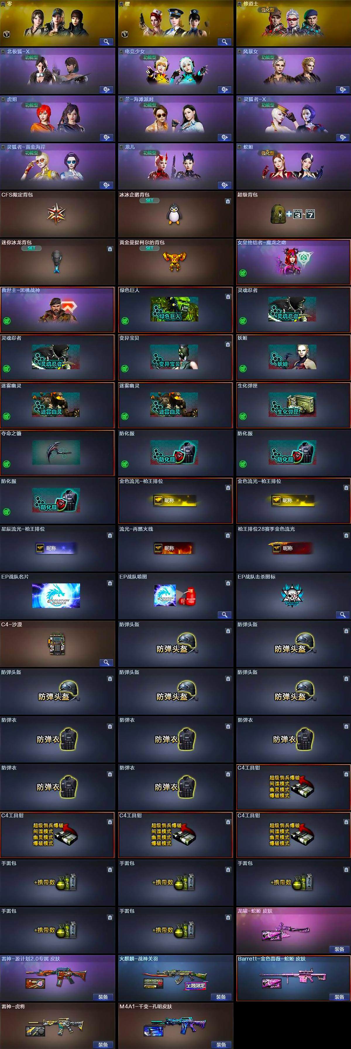 【道具】:CFS限定背包,冰冰企鹅背包,超级背包,迷你冰龙背包,黄金曼提柯尔的背包,女皇终结者-魔龙之吻,救世主-黑桃战神,绿色巨人,灵魂忍者*2,变异宝贝,妖姬,迷雾幽灵*2,生化弹匣,夺命之镰,防化服*3,金色流光-枪王排位*2,星辰流光-枪王排位,流光-再燃火线,枪王排位28赛季金色流光,EP战队名片,EP战队喷图,EP战队击杀图标,C4-沙漠,防弹头盔*5,防弹衣*5,C4工具钳*4,手雷包*5