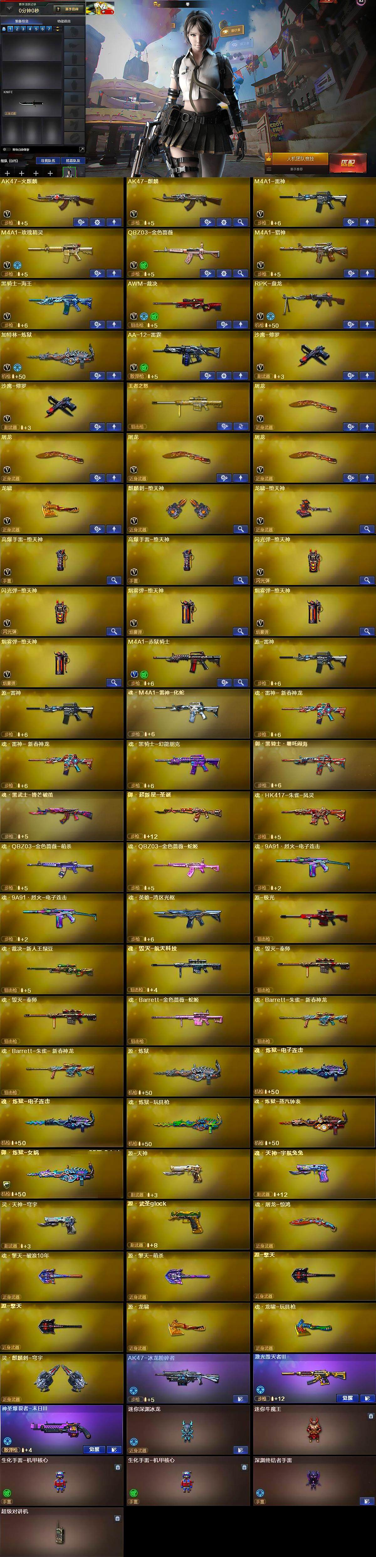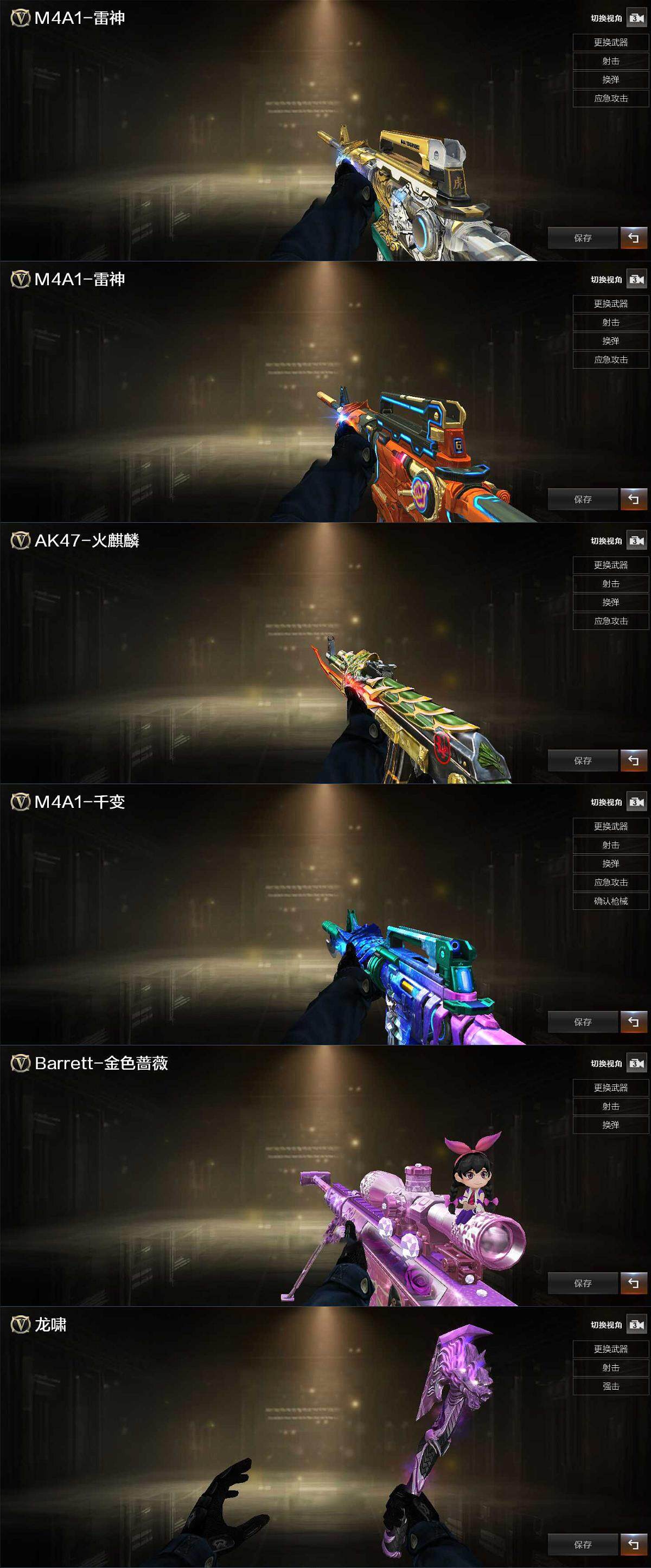 【英雄级武器】:AK47-火麒麟,AK47-麒麟,M4A1-雷神,M4A1-玫瑰精灵,QBZ03-金色蔷薇,M4A1-猎神,黑骑士-海王,AWM-裁决,RPK-盘龙,加特林-炼狱,AA-12-雷霆,沙鹰-修罗*2,屠龙*4,龙啸,麒麟刺-堕天神,龙啸-堕天神,高爆手雷-堕天神*2,闪光弹-堕天神*2,烟雾弹-堕天神*3,M4A1-赤狱骑士