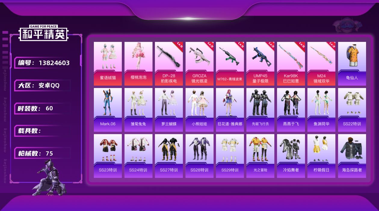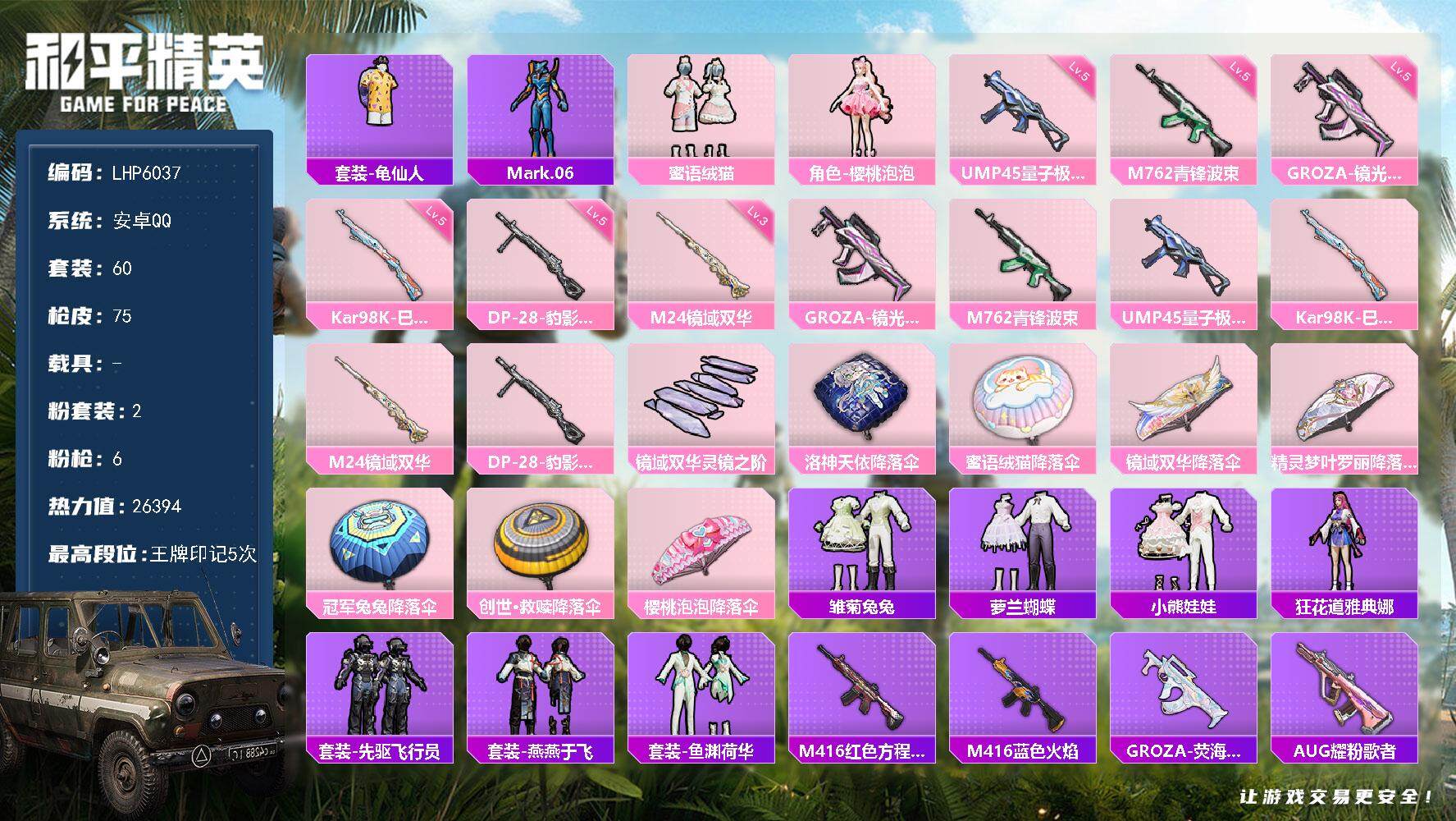 [13824603]可二次【店主推荐捡漏号!可直接换绑】 安卓 手Q-2粉装-6特效枪-1粉色飞行器-2.6w热力值-5王牌印记-60套装-75枪皮【热门品类】:套装-龟仙人,角色-Mark.06【粉色套装】:粉装-蜜语绒猫,角色-樱桃泡泡【粉色枪皮等级】:GROZA-镜光银凌(五级),M762-青锋波束(五级),UMP45-量子极限(五级),Kar98K-巳巳如意(五级),M24-镜域双华(三级),DP-28-豹影疾电(五级)【粉色飞行器】:镜域双华-灵镜之阶