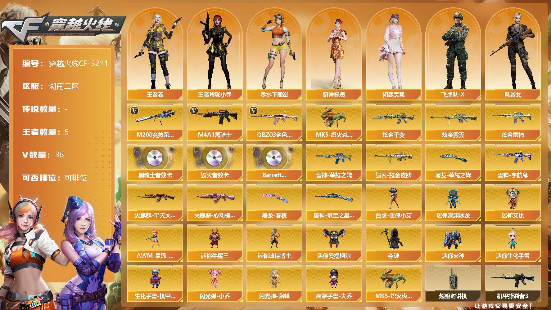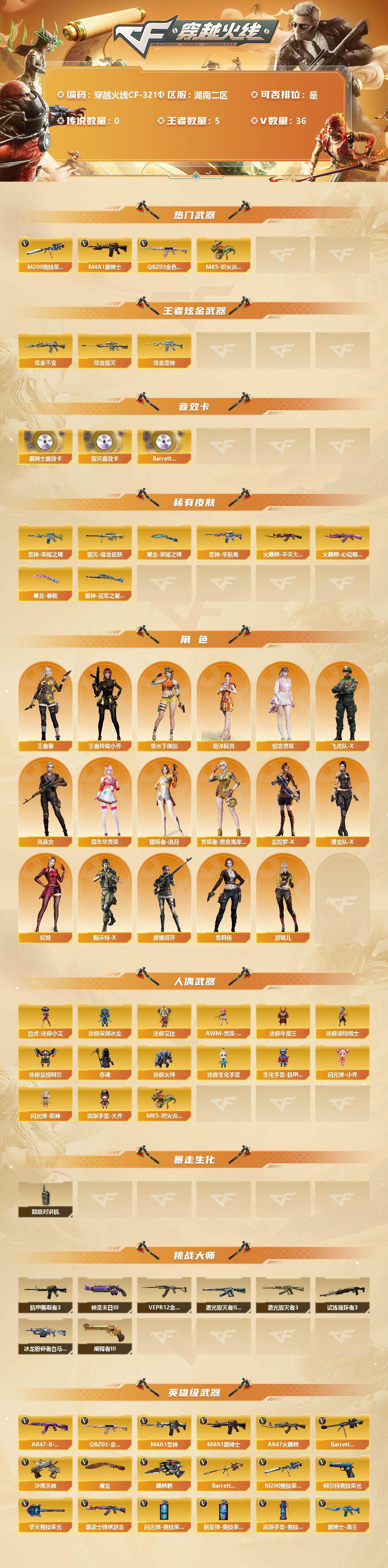 [13238474]湖南二区-36V-5王者-3炫金 【热门武器】:QBZ03-金色蔷薇,M200-竞技荣光,M4A1-黑骑士,MK5-炽火炎龙 【王者炫金武器】:炫金千变,炫金毁灭,炫金雷神 【音效卡】:M4A1-黑骑士音效卡,Barrett-毁灭音效卡,Barrett-碧霄极光音效卡 【皮肤】:Kar98K-星神-冠军之星皮肤,雷神-暗月,雷神-荣耀之魄,雷神-宇航兔皮肤,雷神-源计划2.0专属 皮肤,火麒麟-雷神,火麒麟-平天大圣,火麒麟-心动糖果,毁灭耀金皮肤,战神-粉色甜心皮肤,战神-紫绶金章皮肤,战神-流金岁月皮肤,AK47-B-常胜将军-曹操*2,AK47-B-常胜将军-孙权*2,屠龙-荣耀之锋,屠龙-春桃 皮肤 【角色】:王者春,王者玲珑-小乔,奇洋探员,初恋灵狐,飞虎队-X,风暴女,嘉年华灵狐,猎狐者-追月,零-水下丽影,灵狐者-黄金海岸,曼陀罗-X,潜龙队-X,蛇姬,斯沃特-X,新娜塔莎,雪莉杨,游珑儿 【人偶武器】:白虎-迷你小艾,MK5-炽火炎龙,AWM-灵狐-15周年嘉年华,迷你艾比,迷你深渊冰龙,迷你牛魔王,迷你波特博士*3,迷你曼提柯尔,夺魂,迷你火种,迷你生化手雷,生化手雷-机甲核心,闪光弹-小乔,闪光弹-貂蝉,高爆手雷-大乔 【暴走生化】:超级对讲机 【挑战大师】:冰龙粉碎者-白马银枪,激光毁灭者III-白马银枪,VEPR-12-金魔,激光毁灭者III,机甲撕裂者III,试炼破坏者III,神圣爆裂者-末日III,阐释者III 【英雄级武器】:AK47-火麒麟,M4A1-雷神*2,M4A1-黑骑士,黑武士-锦绣游龙,QBZ03-金色蔷薇,AK-47-猩红传说*2,AK47-B-战神,王者炎心-觉醒版,王者火魄-觉醒版,黑骑士-海王*2,AK47-B-常胜将军,Barrett-毁灭,Barrett-朱雀,M200-竞技荣光,沙鹰-天神*4,柯尔特-竞技荣光,屠龙*2,麒麟刺,擎天-竞技荣光,王者之啸-觉醒版,高爆手雷-竞技荣光,高爆手雷-云龙,手雷-热带奇洋,闪光弹-竞技荣光,闪光弹-云龙,烟雾弹-竞技荣光,烟雾弹-云龙,M4A1-赤狱骑士,Barrett-碧霄极光 【特殊枪械】:1黑骑士