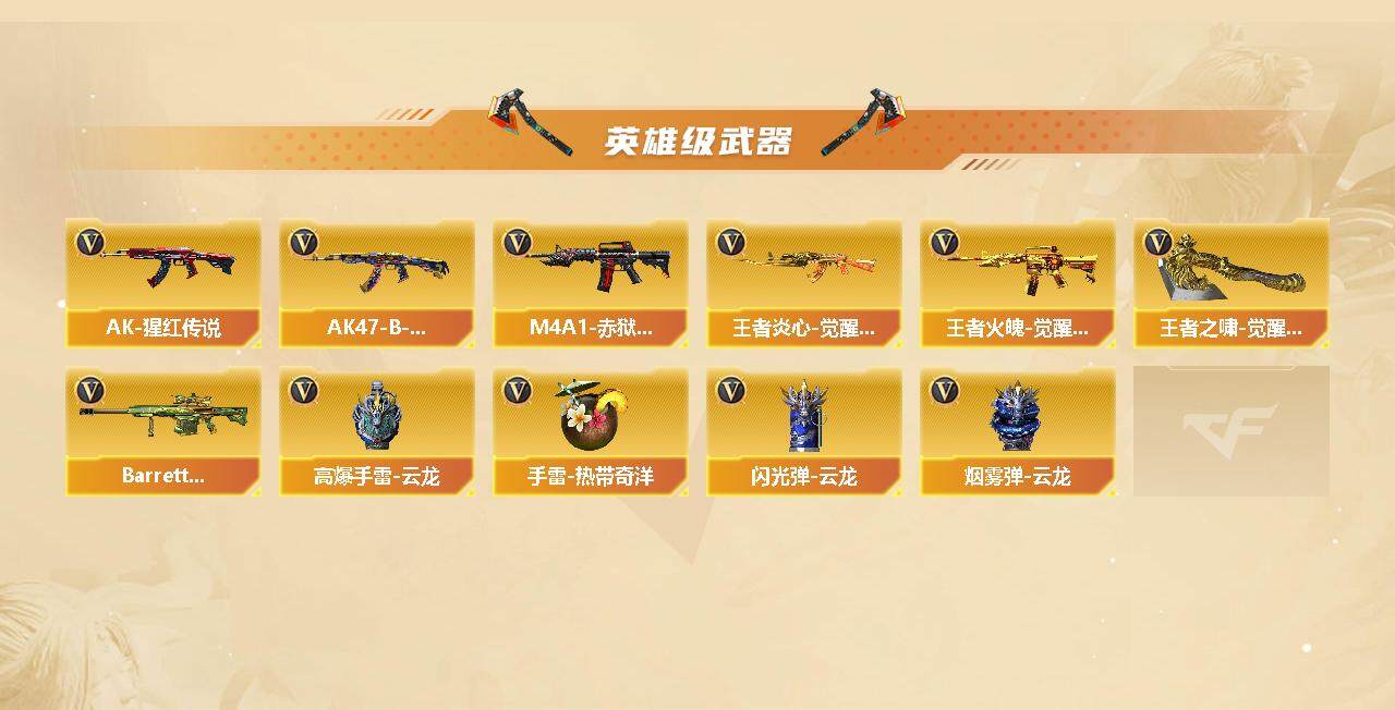 【英雄级武器】:AK47-火麒麟,M4A1-雷神*2,M4A1-黑骑士,黑武士-锦绣游龙,QBZ03-金色蔷薇,AK-47-猩红传说*2,AK47-B-战神,王者炎心-觉醒版,王者火魄-觉醒版,黑骑士-海王*2,AK47-B-常胜将军,Barrett-毁灭,Barrett-朱雀,M200-竞技荣光,沙鹰-天神*4,柯尔特-竞技荣光,屠龙*2,麒麟刺,擎天-竞技荣光,王者之啸-觉醒版,高爆手雷-竞技荣光,高爆手雷-云龙,手雷-热带奇洋,闪光弹-竞技荣光,闪光弹-云龙,烟雾弹-竞技荣光,烟雾弹-云龙,M4A1-赤狱骑士,Barrett-碧霄极光