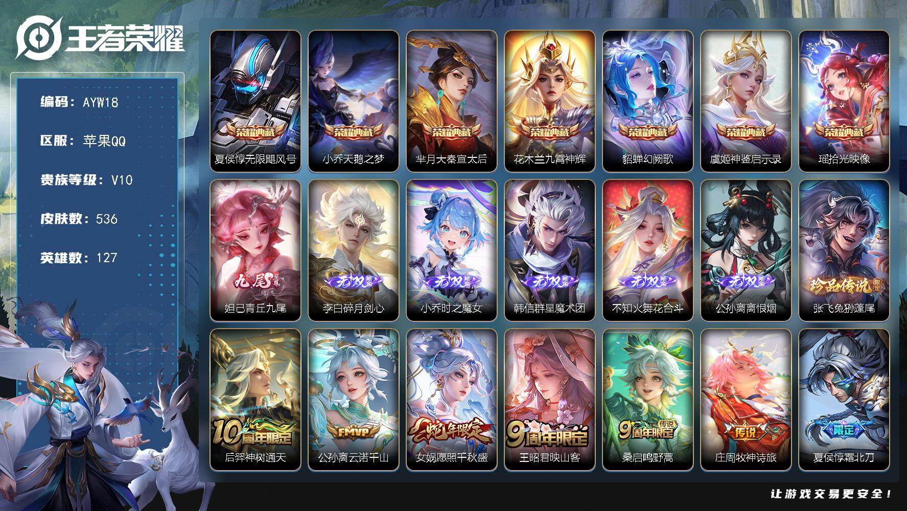 [13854650]【店主推荐捡漏号!可直接换绑】小国标李信苹果Q-V10-最强王者段位-127英雄-536皮肤-7典藏-6无双-1珍品传说-78传说-184史诗 【英雄全皮】:刘禅全皮,姜子牙全皮,孙权全皮,王昭君全皮,艾琳全皮,娜可露露全皮,橘右京全皮,鬼谷子全皮,黄忠全皮,米莱狄全皮,李信全皮,盾山全皮,猪八戒全皮,蒙恬全皮,阿古朵全皮,桑启全皮,海诺全皮 【荣耀典藏】:夏侯惇无限飓风号,小乔天鹅之梦,芈月大秦宣太后,花木兰九霄神辉,貂蝉幻阙歌,虞姬神鉴启示录,瑶拾光映像 【无双皮肤】:妲己青丘九尾,李白碎月剑心,小乔时之魔女,韩信群星魔术团,不知火舞花合斗,公孙离离恨烟 【珍品传说】:张飞兔狲蓬尾 【传说皮肤】:后羿神树通天,公孙离云诺千山,女娲愿照千秋盛,王昭君映山客,桑启鸣野蒿,庄周牧神诗旅,夏侯惇霜北刀,铠冥王哈迪斯,朵莉亚心动手记,云中君群星魔术团,墨子黄金天蝎座,海月金乌负日,亚连落雪白狼,吕布曦玄引,貂蝉曦玄引,典韦战鼓燎原,孙尚香乘龙问璇玑,孙策乘龙淬吴钩,赵云乘龙铭钟鼎,马超琥珀纪元,铠琥珀纪元,澜逐花归海,艾琳觅芳踪,露娜霜月吟,孙膑小动物乐团,狄仁杰夜礼服假面,王昭君永恒水手月亮,甄姬至美化雀舞,吕布遇见神鼓,马可波罗妄想实况,东皇太一灼幽烈阳,干将莫邪画中仙,伽罗炽翼辉光,李信山海炽霜斩,李白诗剑行,王昭君星穹之声,百里守约碎云,橘右京枫霜尽,娜可露露前尘镜,后羿无尽星芒,马超无双飞将,大乔挚爱花嫁,孙策挚爱之约,女娲补天,孙策末日机甲,瑶时之祈愿,貂蝉遇见胡旋,赵云淬星耀世,王昭君乞巧织情,西施游龙清影,周瑜音你心动,小乔音你心动,李元芳飞鸢探春,兰陵王默契交锋,公孙离祈雪灵祝,诸葛亮时雨天司,镜炽阳神光,虞姬启明星使,孙悟空零号赤焰,关羽武圣,曜云鹰飞将,李信一念神魔,刘备时之恋人,伽罗太华,貂蝉猫影幻舞,张良黄金白羊座,干将莫邪久胜战神,虞姬云霓雀翎,达摩黄金狮子座,百里玄策白虎志,花木兰冠军飞将,梦奇胖达荣荣,后羿黄金射手座,貂蝉仲夏夜之梦,孙尚香末日机甲,宫本武藏地狱之眼,吕布天魔缭乱,狄仁杰超时空战士 【限定皮肤】:白起狰,公孙离离恨烟,夏侯惇霜北刀,铠冥王哈迪斯,暃埋骨钱,蒙犽顽岩魄,蔡文姬夏日便利店,大乔绒语心约,虞姬夏日便利店,姜子牙天穹之誓,李白谪仙醉月,狄仁杰阴阳师,虞姬凯尔特女王,赵云皇家上将,墨子神迹守卫,妲己时之彼端,嬴政白昼