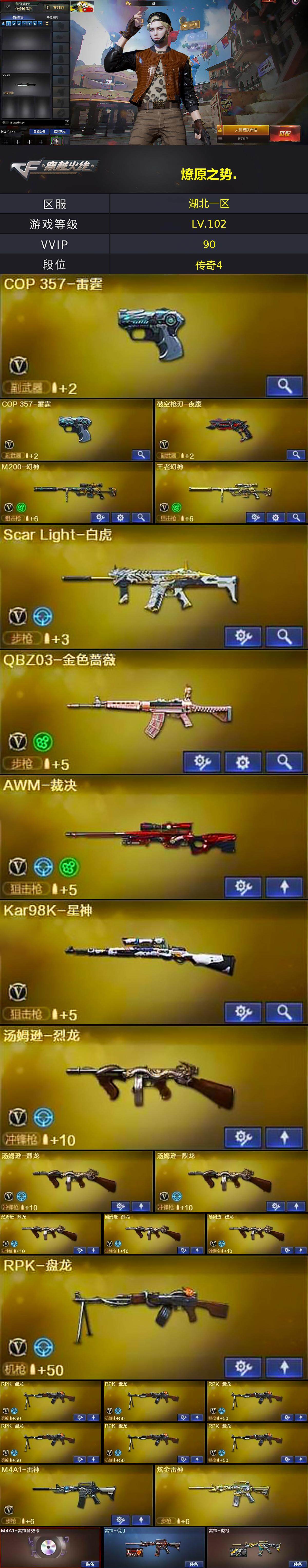 【热门武器】:QBZ03-金色蔷薇,Scar Light-白虎,HK417-朱雀,M200-幻神,死亡之眼,王者炎心,Kar98K-星神,M4A1-黑骑士,汤姆逊-烈龙*6,RPK-盘龙*7,加特林-炼狱,COP-白鲨,沙鹰-修罗*2