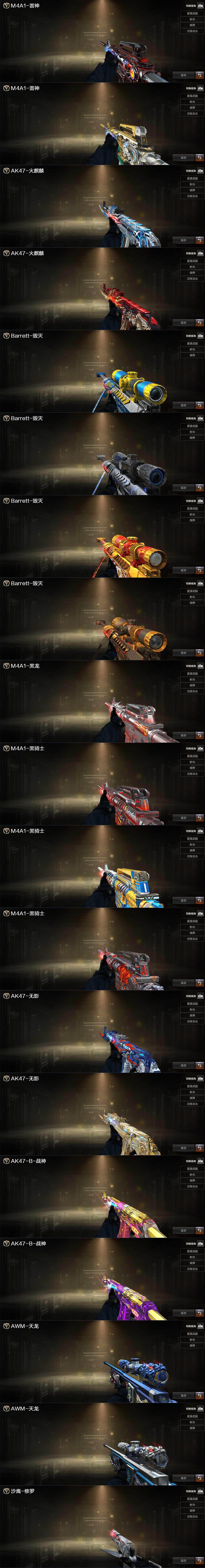 【英雄级武器】:AK47-火麒麟*2,M4A1-黑龙*2,M4A1-雷神,M4A1-黑骑士,AK47-无影,M4A1-死神,AN94-超新星,HK417-朱雀,Scar Light-白虎,无影-神兵利器,黑武士-锦绣游龙,M4A1-玫瑰精灵*3,QBZ03-金色蔷薇,王者之翼-觉醒版,王者之武-觉醒版,AK-47-猩红传说*3,AK47-B-战神,黑骑士-海王,AWM-天龙*2,Barrett-毁灭*2,AWM-裁决,M200-幻神,Kar98K-星神,王者之怒-觉醒版,王者幻神-觉醒版,RPK-盘龙*7,加特林-炼狱,汤姆逊-烈龙*6,沙鹰-修罗*2,沙鹰-天神*2,雷霆之契*2,破空枪刃-夜魔,屠龙*2,龙啸,马来剑-夜魔,擎天,麒麟刺*2,斩神刀-雷暴,王者之啸-觉醒版,高爆手雷-雷霆*4,高爆手雷-雷暴,高爆手雷-夜魔*4,闪光弹-雷霆*4,闪光弹-雷暴,闪光弹-夜魔*4,烟雾弹-雷霆*4,烟雾弹-雷暴,烟雾弹-夜魔*4,M4A1-赤狱骑士