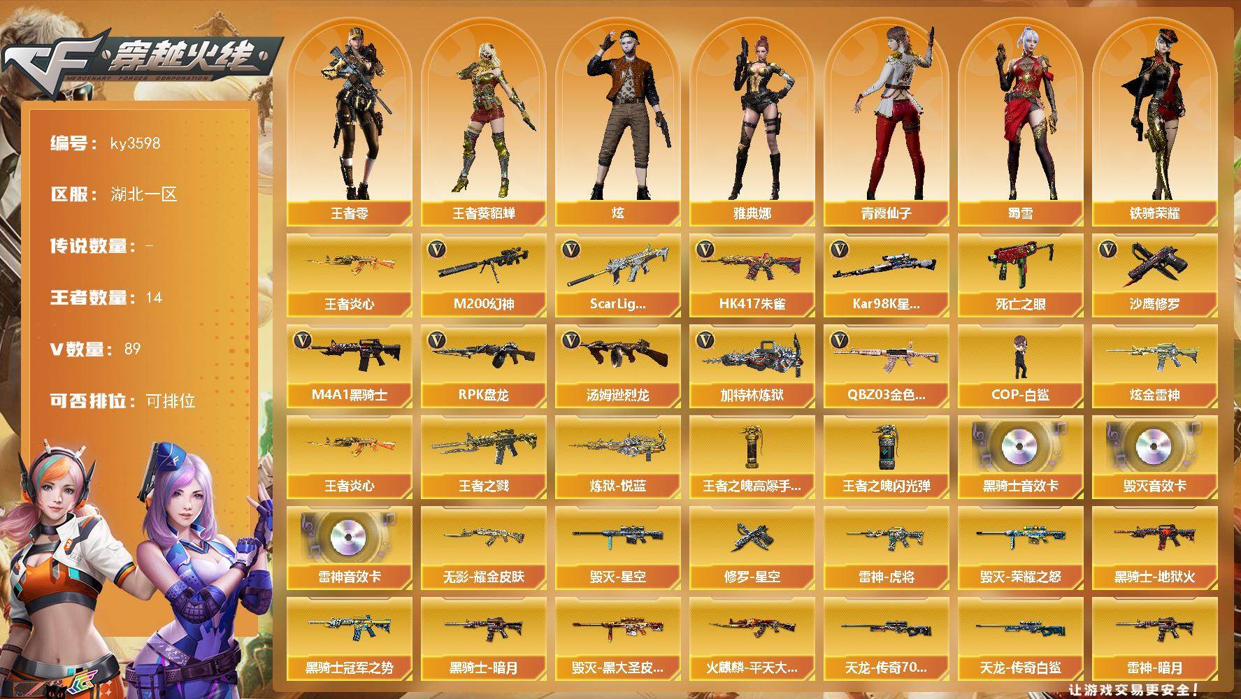[13854573]湖北一区-89V-14王者-1炫金 【热门武器】:QBZ03-金色蔷薇,Scar Light-白虎,HK417-朱雀,M200-幻神,死亡之眼,王者炎心,Kar98K-星神,M4A1-黑骑士,汤姆逊-烈龙*6,RPK-盘龙*7,加特林-炼狱,COP-白鲨,沙鹰-修罗*2 【王者炫金武器】:王者炎心,王者之戮,炼狱-悦蓝,炫金雷神,王者之魄高爆手雷*2,王者之魄闪光弹 【音效卡】:M4A1-雷神音效卡,M4A1-黑骑士音效卡,Barrett-毁灭音效卡 【皮肤】:雷神-暗月,雷神-虎将,火麒麟-雷神,火麒麟-平天大圣,毁灭-荣耀之怒,毁灭-星空,毁灭-黑大圣皮肤,毁灭-英雄计划 皮肤,黑龙-暗月,黑骑士-暗月,黑骑士-冠军之势,黑骑士-地狱火,无影-能量核心,无影耀金皮肤,战神-粉色甜心皮肤*2,战神-紫绶金章皮肤*2,AWM-天龙-传奇70KG,AWM-天龙-传奇白鲨,修罗-星空 【角色】:炫,王者-葵-貂蝉,王者-零,暗夜-X,风暴女,嘉年华灵狐,灵狐者-黄金海岸,龙儿,麻雀,曼陀罗-X,潘多拉-X,潜龙队-X,青霞仙子,蜀雪,铁骑荣耀,雪莉杨,影武者-X,游珑儿,雅典娜 【人偶武器】:COP-白鲨,AWM-灵狐-15周年嘉年华,迷你深渊冰龙,迷你牛魔王,闪光弹-小乔 【暴走生化】:死亡之眼,超级对讲机 【英雄级武器】:AK47-火麒麟*2,M4A1-黑龙*2,M4A1-雷神,M4A1-黑骑士,AK47-无影,M4A1-死神,AN94-超新星,HK417-朱雀,Scar Light-白虎,无影-神兵利器,黑武士-锦绣游龙,M4A1-玫瑰精灵*3,QBZ03-金色蔷薇,王者之翼-觉醒版,王者之武-觉醒版,AK-47-猩红传说*3,AK47-B-战神,黑骑士-海王,AWM-天龙*2,Barrett-毁灭*2,AWM-裁决,M200-幻神,Kar98K-星神,王者之怒-觉醒版,王者幻神-觉醒版,RPK-盘龙*7,加特林-炼狱,汤姆逊-烈龙*6,沙鹰-修罗*2,沙鹰-天神*2,雷霆之契*2,破空枪刃-夜魔,屠龙*2,龙啸,马来剑-夜魔,擎天,麒麟刺*2,斩神刀-雷暴,王者之啸-觉醒版,高爆手雷-雷霆*4,高爆手雷-雷暴,高爆手雷-夜魔*4,闪光弹-雷霆*4,闪光弹-雷暴,闪光弹-夜魔*4,烟雾弹-雷霆*4,烟雾弹-雷暴,烟雾弹-夜魔*4,M4A1-赤狱骑士 【道具】:B