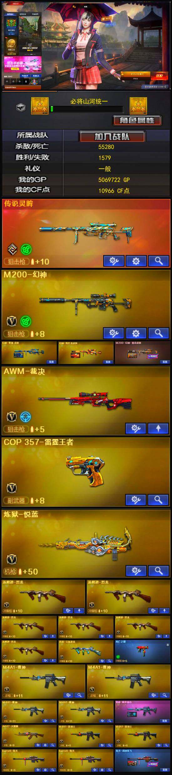 【热门武器】:传说灵眸,M200-幻神,死亡之眼,M4A1-黑骑士*2,汤姆逊-烈龙*6,毁灭-孙三炮,沙鹰-修罗