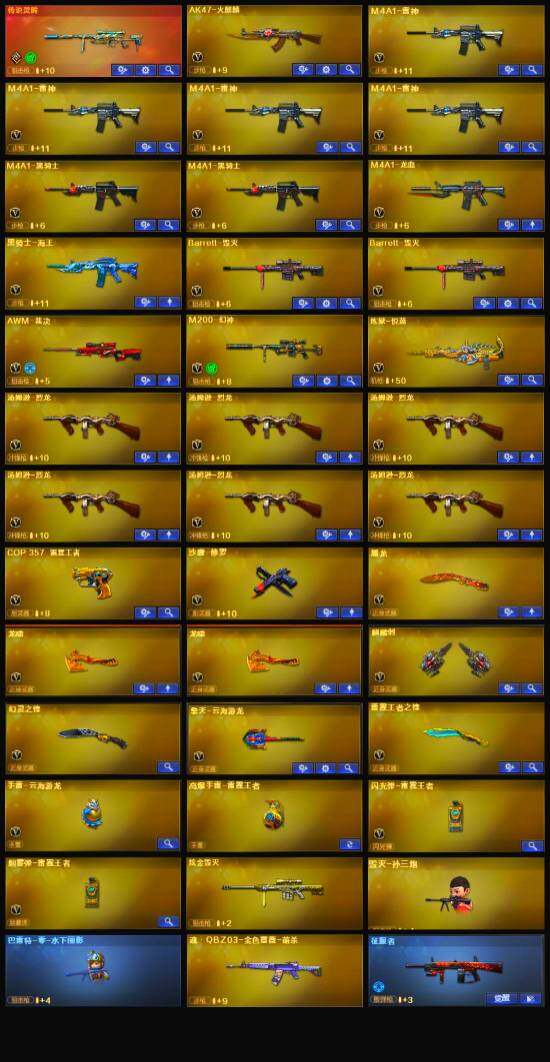 【英雄级武器】:AK47-火麒麟,M4A1-雷神*4,M4A1-黑骑士*2,M4A1-龙血,黑骑士-海王,Barrett-毁灭*2,AWM-裁决,M200-幻神,炼狱-悦蓝-觉醒版,汤姆逊-烈龙*6,烈龙-云海游龙,沙鹰-修罗,COP 357-雷霆王者-觉醒版,屠龙,龙啸*2,麒麟刺,幻灵之锋,擎天-云海游龙,雷霆王者之锋-觉醒版,手雷-云海游龙,高爆手雷-雷霆王者