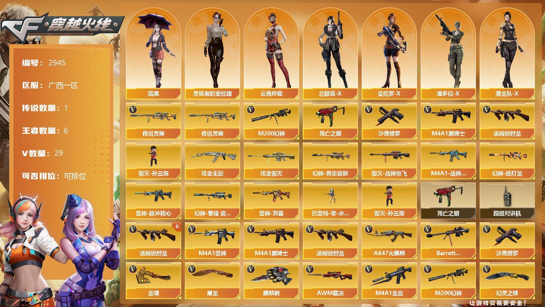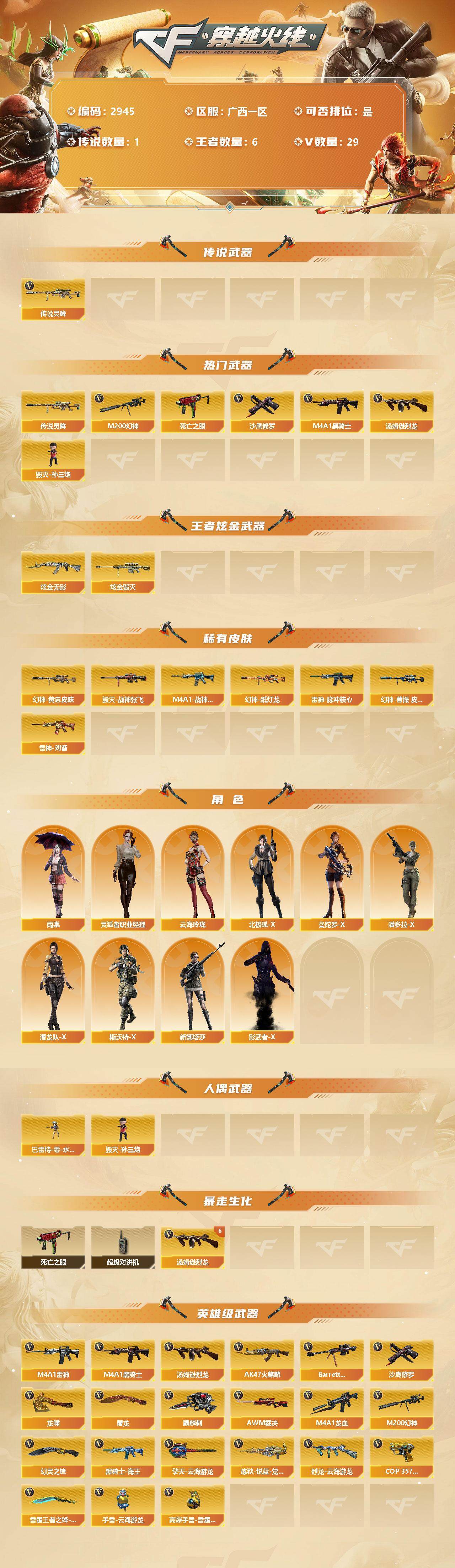 [13299064]广西一区-29V-6王者-2炫金 【传说武器】:传说灵眸 【热门武器】:传说灵眸,M200-幻神,死亡之眼,M4A1-黑骑士*2,汤姆逊-烈龙*6,毁灭-孙三炮,沙鹰-修罗 【王者炫金武器】:炫金无影,炫金毁灭 【皮肤】:M200-幻神-黄忠皮肤,幻神-纸灯龙皮肤,幻神-曹操 皮肤,M4A1-战神赵云,雷神-脉冲核心,雷神-刘备 皮肤*2,毁灭-战神张飞,M4A1-千变-孔明皮肤 【角色】:雨棠,云海玲珑,北极狐-X,灵狐者-职业经理,曼陀罗-X,潘多拉-X,潜龙队-X,斯沃特-X,新娜塔莎,影武者-X 【人偶武器】:毁灭-孙三炮,巴雷特-零-水下丽影 【暴走生化】:死亡之眼,超级对讲机 【英雄级武器】:AK47-火麒麟,M4A1-雷神*4,M4A1-黑骑士*2,M4A1-龙血,黑骑士-海王,Barrett-毁灭*2,AWM-裁决,M200-幻神,炼狱-悦蓝-觉醒版,汤姆逊-烈龙*6,烈龙-云海游龙,沙鹰-修罗,COP 357-雷霆王者-觉醒版,屠龙,龙啸*2,麒麟刺,幻灵之锋,擎天-云海游龙,雷霆王者之锋-觉醒版,手雷-云海游龙,高爆手雷-雷霆王者 【特殊枪械】:2黑骑士,6烈龙