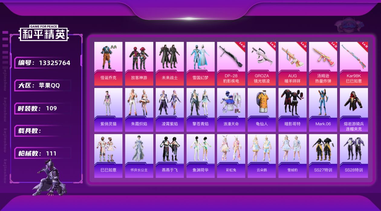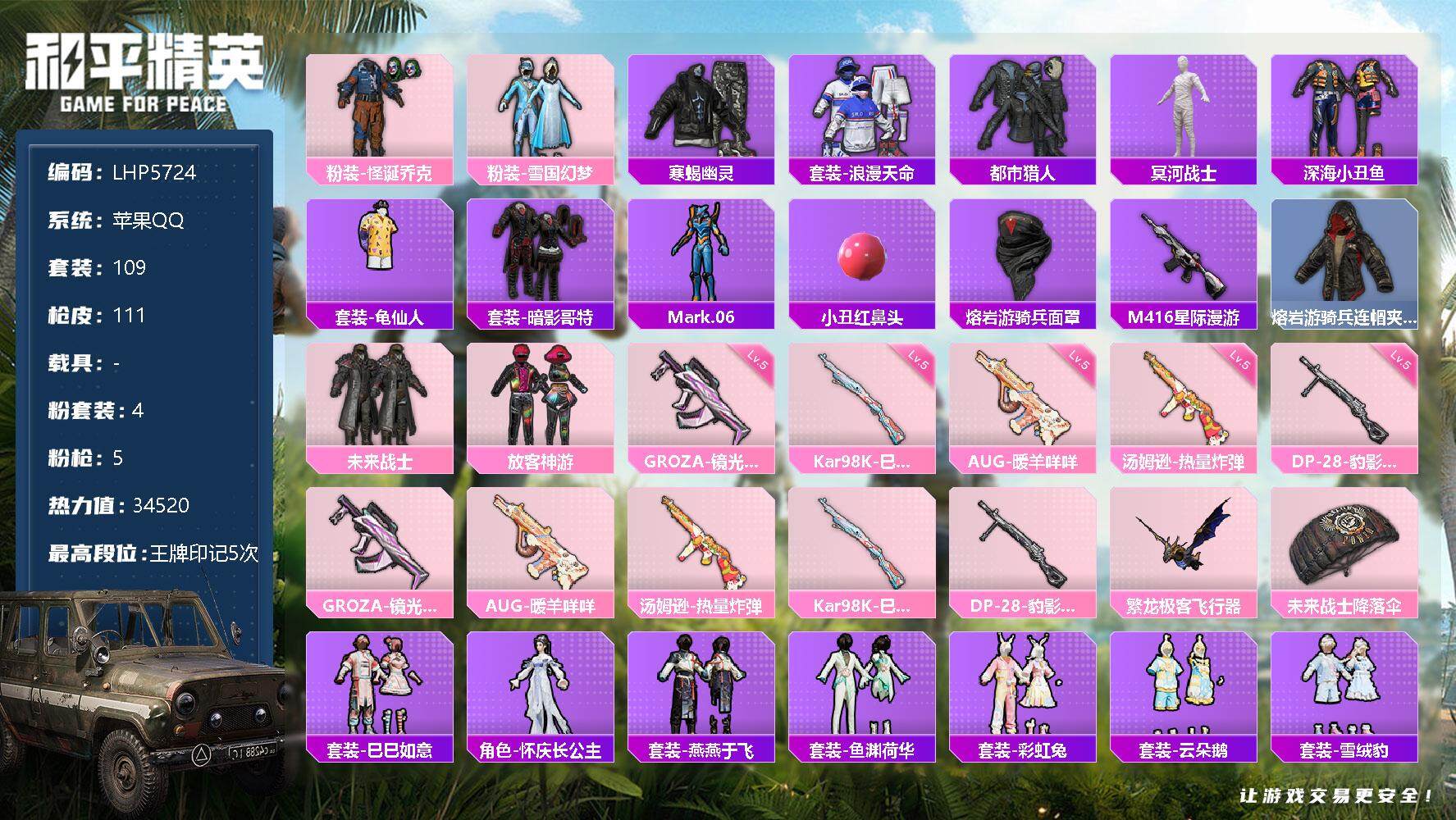 [13325764]【店主推荐捡漏号!可直接换绑】素材身法号/老木乃伊/地铁满天赋 苹果 手Q-4粉装-5特效枪-1粉色飞行器-3.4w热力值-5王牌印记-109套装-111枪皮【热门品类】:粉装-怪诞乔克,粉装-雪国幻梦,套装-寒蝎幽灵,套装-浪漫天命,套装-都市猎人,套装-冥河战士,套装-深海小丑鱼,套装-龟仙人,套装-暗影哥特,角色-Mark.06,小丑红鼻头,熔岩游骑兵面罩,M416-星际漫游,熔岩游骑兵连帽夹克【粉色套装】:粉装-未来战士,粉装-怪诞乔克,粉装-雪国幻梦,粉装-放客神游【粉色枪皮等级】:GROZA-镜光银凌(五级),AUG-暖羊咩咩(五级),汤姆逊-热量炸弹(五级),Kar98K-巳巳如意(五级),DP-28-豹影疾电(五级)【粉色飞行器】:繁龙极客飞行器
