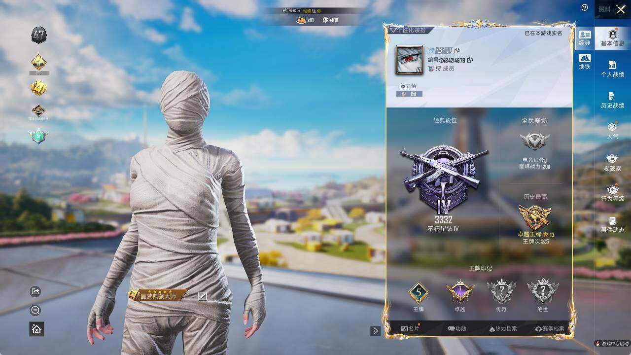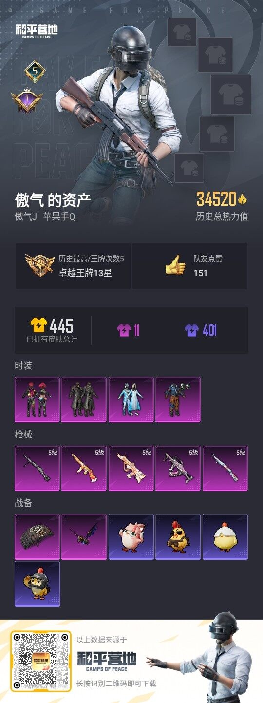 - 安卓QQ 可二次 当前段位不朽星钻Ⅲ 历史最高段位绝世王牌15星 热力值115763 等级70 套装236 王牌次数16 点券46 外观套装14 枪械皮肤13 热门紫装24 载具1 飞行器4 稀有0 头盔5 背包5