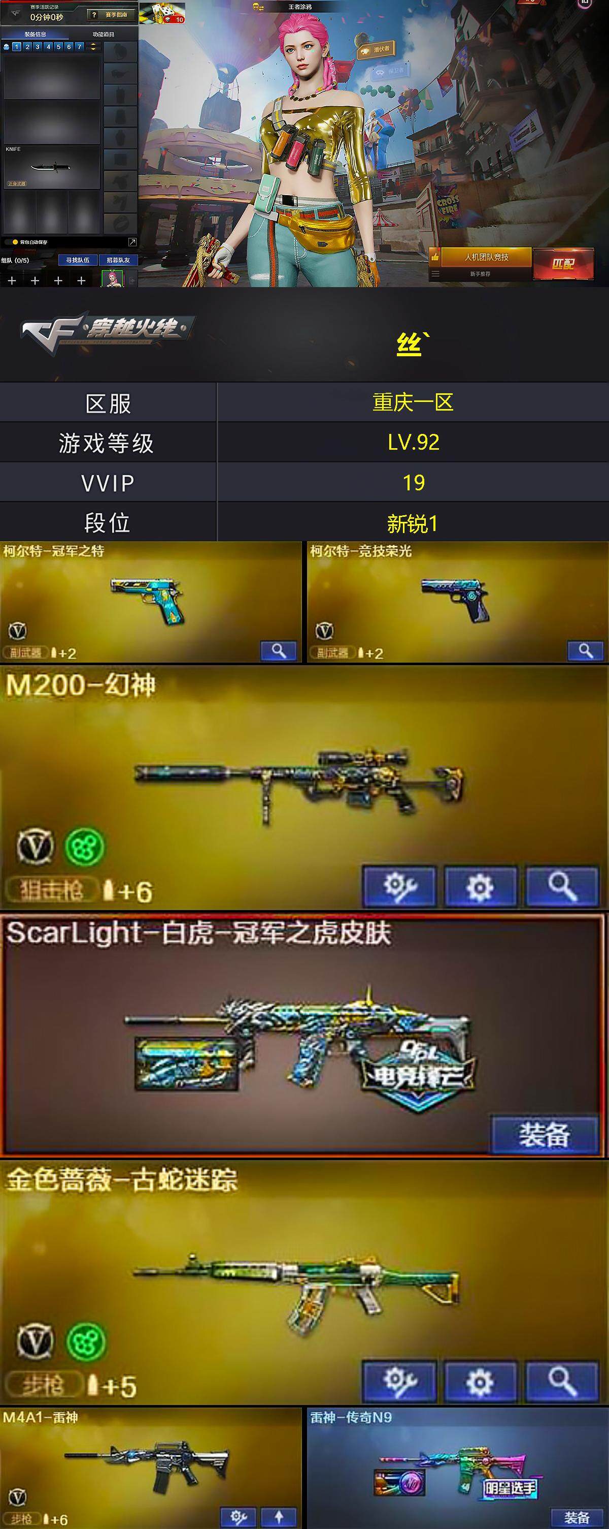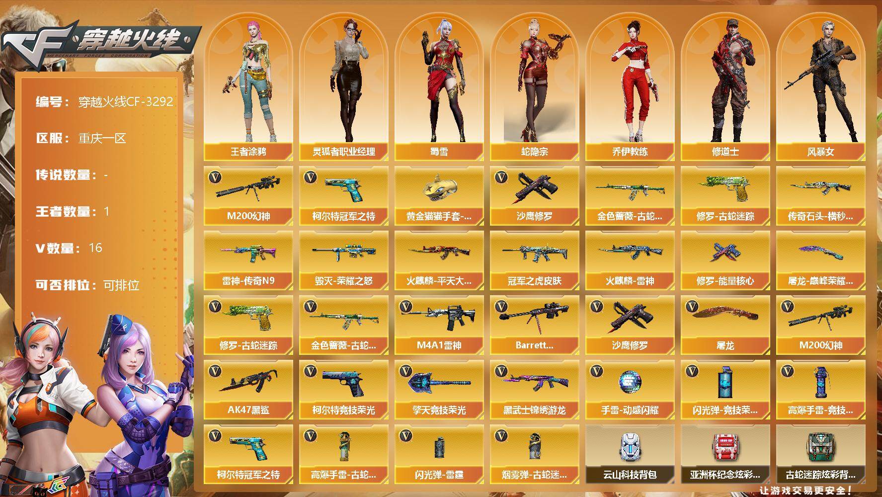 [13436834]重庆一区-16V-1王者-0炫金 【热门武器】:M200-幻神,金色蔷薇-古蛇迷踪,修罗-古蛇迷踪,柯尔特-冠军之特,沙鹰-修罗,黄金猫猫手套-白鲨 【皮肤】:ScarLight-白虎-冠军之虎皮肤,雷神-传奇N9,火麒麟-雷神,传奇石头-横秒之巅,火麒麟-平天大圣,毁灭-荣耀之怒,修罗-能量核心,屠龙-巅峰荣耀 皮肤 【角色】:王者涂鸦,蛇隐宗,乔伊教练,修道士,风暴女,灵狐者-X,灵狐者-职业经理,麻雀,潘多拉-X,蛇姬,蜀雪 【英雄级武器】:M4A1-雷神,AK47-黑鲨,黑武士-锦绣游龙,金色蔷薇-古蛇迷踪,Barrett-毁灭,M200-幻神,沙鹰-修罗,柯尔特-冠军之特,柯尔特-竞技荣光,修罗-古蛇迷踪,屠龙,擎天-竞技荣光,高爆手雷-竞技荣光,手雷-动感闪耀,高爆手雷-古蛇迷踪,闪光弹-雷霆,闪光弹-竞技荣光*2,烟雾弹-古蛇迷踪 【道具】:云山科技背包,亚洲杯纪念炫彩背包,古蛇迷踪炫彩背包,超级背包,女皇终结者-魔龙之吻,救世主-黑桃战神,绿色巨人,灵魂忍者,迷雾幽灵,生化弹匣,夺命之镰,防化服*3,金色流光-枪王排位*2,星辰流光-枪王排位,枪王排位28赛季金色流光,枪王排位29赛季金色流光,古蛇迷踪打击特效,蛇隐宗表情,电玩兔兔表情,EP战队名片,EP战队喷图,防弹头盔*3,防弹衣*3,C4工具钳*3,手雷包*3 【特殊枪械】: