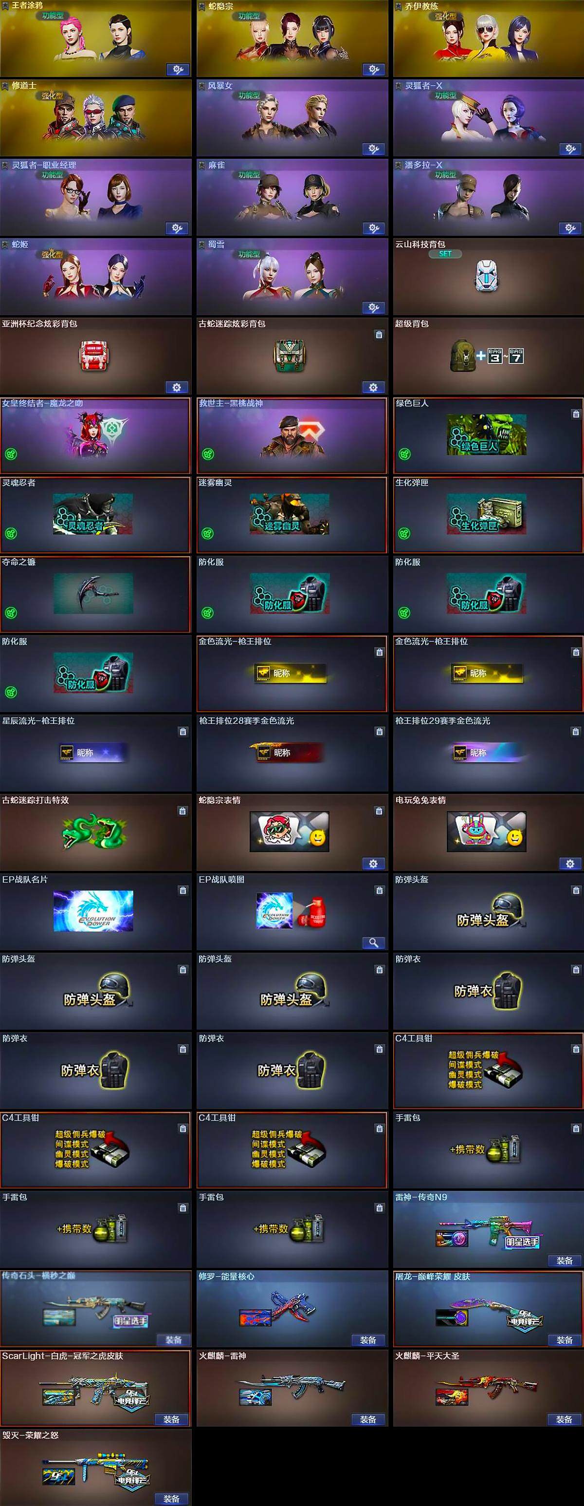 【道具】:云山科技背包,亚洲杯纪念炫彩背包,古蛇迷踪炫彩背包,超级背包,女皇终结者-魔龙之吻,救世主-黑桃战神,绿色巨人,灵魂忍者,迷雾幽灵,生化弹匣,夺命之镰,防化服*3,金色流光-枪王排位*2,星辰流光-枪王排位,枪王排位28赛季金色流光,枪王排位29赛季金色流光,古蛇迷踪打击特效,蛇隐宗表情,电玩兔兔表情,EP战队名片,EP战队喷图,防弹头盔*3,防弹衣*3,C4工具钳*3,手雷包*3