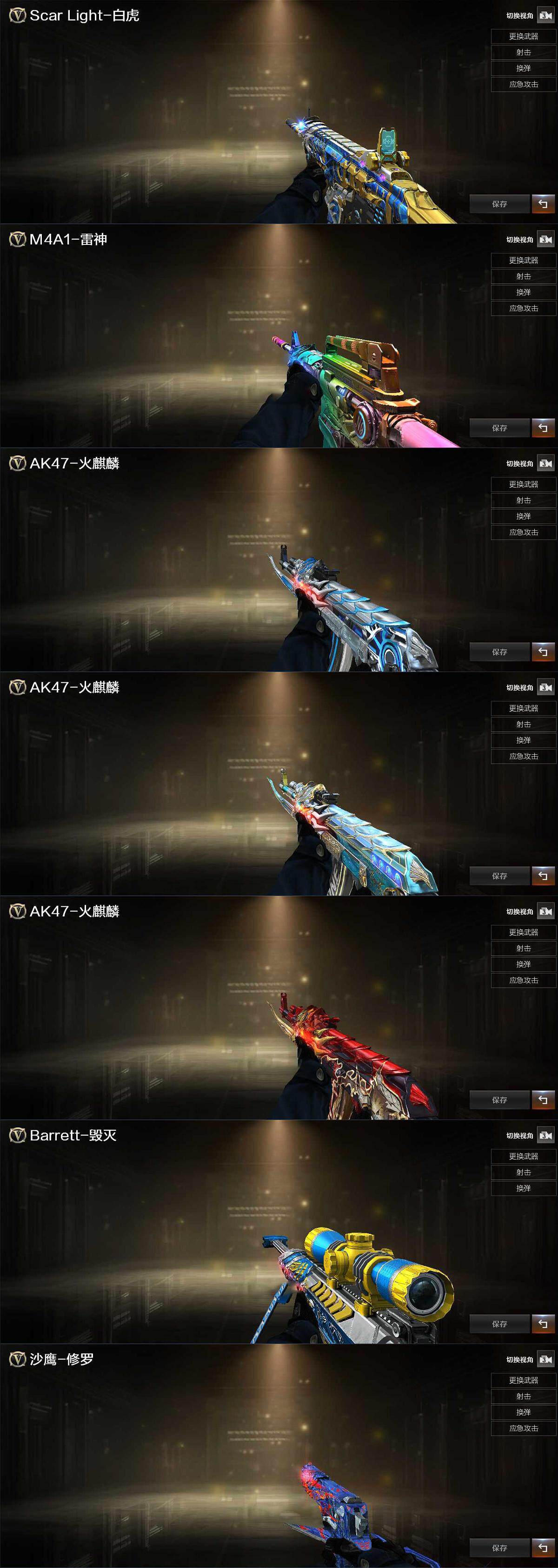 【英雄级武器】:M4A1-雷神,AK47-黑鲨,黑武士-锦绣游龙,金色蔷薇-古蛇迷踪,Barrett-毁灭,M200-幻神,沙鹰-修罗,柯尔特-冠军之特,柯尔特-竞技荣光,修罗-古蛇迷踪,屠龙,擎天-竞技荣光,高爆手雷-竞技荣光,手雷-动感闪耀,高爆手雷-古蛇迷踪,闪光弹-雷霆,闪光弹-竞技荣光*2,烟雾弹-古蛇迷踪
