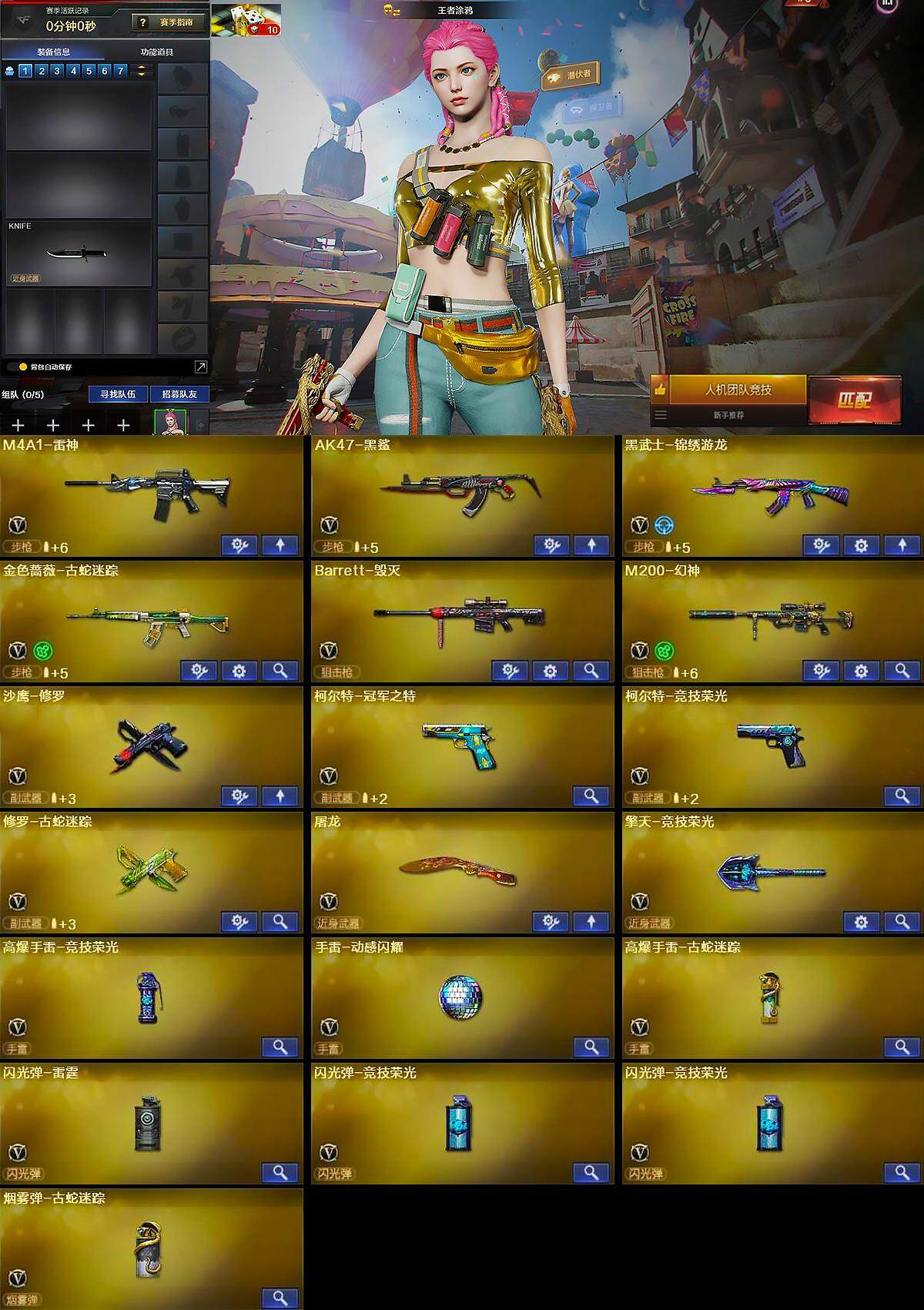- [12201324]【商品标题】:山西一区-7V-0王者-0炫金 【热门武器】:QBZ03-金色蔷薇 【人偶武器】:AWM-灵狐-15周年嘉年华*2,迷你生化手雷,灵狐娃娃手雷 【英雄级武器】:QBZ03-金色蔷薇,M4A1-雷神,Barrett-朱雀,黑武士-锦绣游龙,沙鹰-天神,屠龙