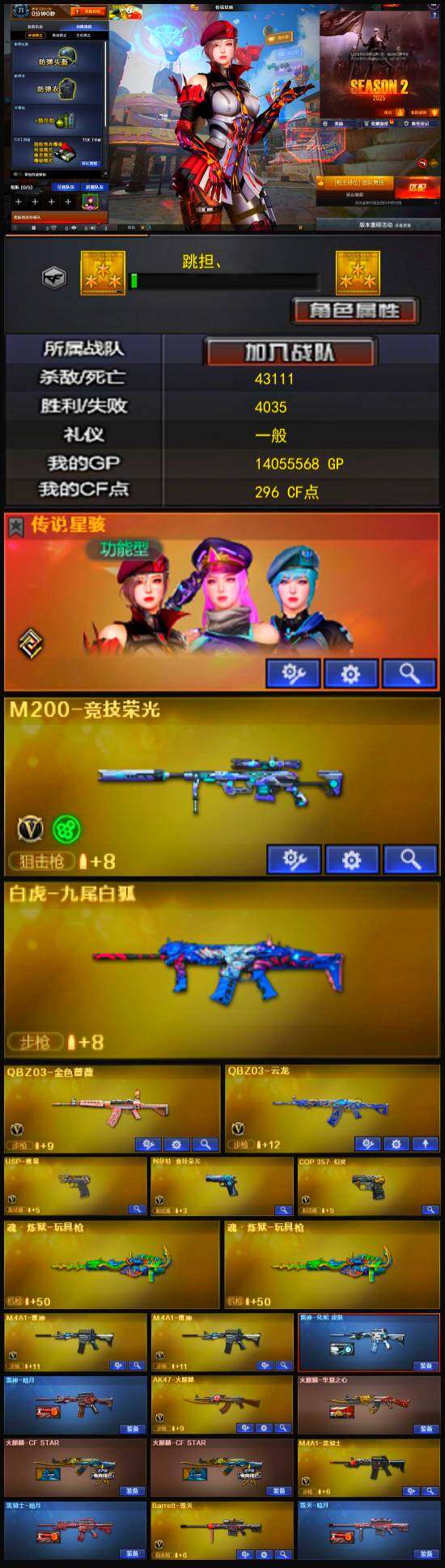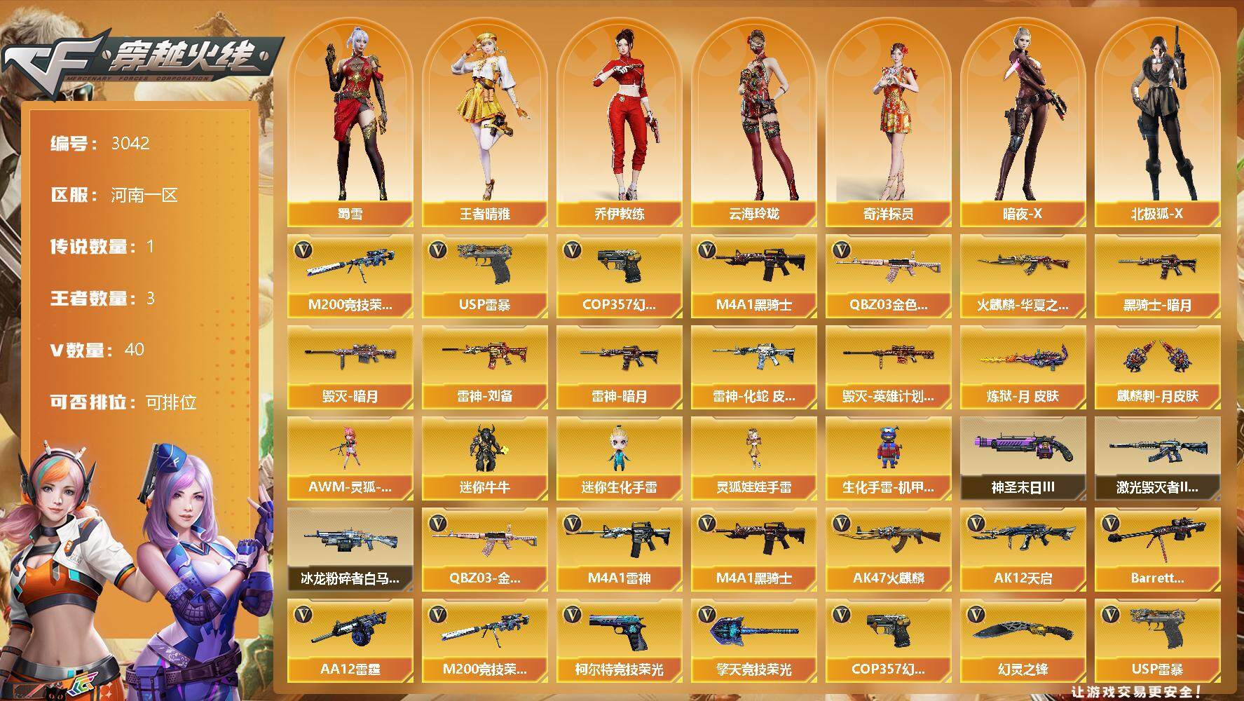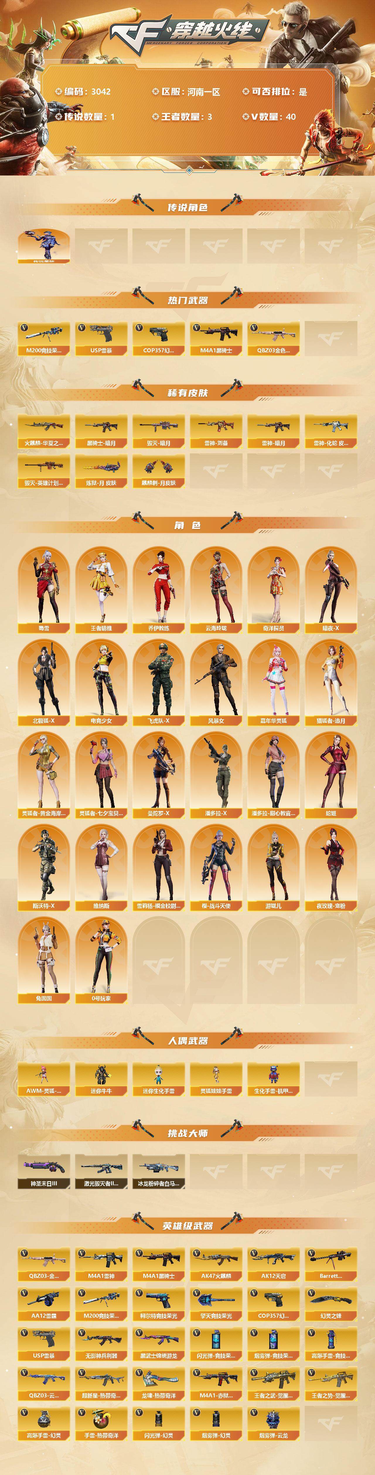 [13463064]河南一区-40V-3王者-0炫金 【传说角色】:传说星骇 【热门武器】:QBZ03-金色蔷薇,M200-竞技荣光,M4A1-黑骑士,USP-雷暴,COP 357-幻灵 【皮肤】:雷神-暗月,雷神-刘备 皮肤,雷神-化蛇 皮肤,火麒麟-华夏之心,毁灭-暗月,毁灭-英雄计划 皮肤,黑骑士-暗月,炼狱-月 皮肤,麒麟刺-月皮肤 【角色】:王者晴雅,奇洋探员,乔伊教练,云海玲珑,暗夜-X,北极狐-X,电竞少女,飞虎队-X,风暴女,嘉年华灵狐,猎狐者-追月,0号玩家,灵狐者-黄金海岸,灵狐者-七夕宝贝,曼陀罗-X,潘多拉-X,潘多拉-甜心教官,蛇姬,斯沃特-X,蜀雪,兔囡囡,维纳斯,雪莉杨-摸金校尉,夜玫瑰-宠粉,樱-战斗天使,游珑儿 【人偶武器】:AWM-灵狐-15周年嘉年华,迷你牛牛*2,迷你生化手雷,生化手雷-机甲核心*2,灵狐娃娃手雷 【挑战大师】:冰龙粉碎者-白马银枪*3,激光毁灭者III-白马银枪,神圣爆裂者-末日III 【英雄级武器】:AK47-火麒麟,M4A1-雷神*2,M4A1-黑骑士,AK12-天启,无影-神兵利器,QBZ03-云龙,黑武士-锦绣游龙,超新星-热带奇洋,QBZ03-金色蔷薇,王者之武-觉醒版,王者之势-觉醒版,Barrett-毁灭,M200-竞技荣光,AA-12-雷霆,USP-雷暴,COP 357-幻灵,柯尔特-竞技荣光,幻灵之锋*2,擎天-竞技荣光,龙啸-热带奇洋,高爆手雷-幻灵*4,高爆手雷-竞技荣光*3,手雷-热带奇洋,闪光弹-幻灵*3,闪光弹-竞技荣光*4,烟雾弹-幻灵,烟雾弹-竞技荣光*4,烟雾弹-云龙,M4A1-赤狱骑士 【道具】:CFS限定背包,云山科技背包,亚洲杯纪念炫彩背包,全能枪王背包,古蛇迷踪炫彩背包,奇洋探员-海龟背包,炫彩背包,热带奇洋炫彩背包,超级背包,女皇终结者-魔龙之吻,救世主-黑桃战神,绿色巨人,灵魂忍者,变异宝贝,迷雾幽灵,生化弹匣,夺命之镰,防化服*3,金色流光-枪王排位*2,星辰流光-枪王排位,巅峰赛先锋-金色流光,枪王排位28赛季金色流光,枪王排位29赛季金色流光,热带奇洋表情,斯沃特表情,EP战队名片,EP战队喷图,EP战队击杀图标,C4-红龙,防弹头盔*4,防弹衣*4,C4工具钳*4,手雷包*4 【特殊枪械】:1黑骑士