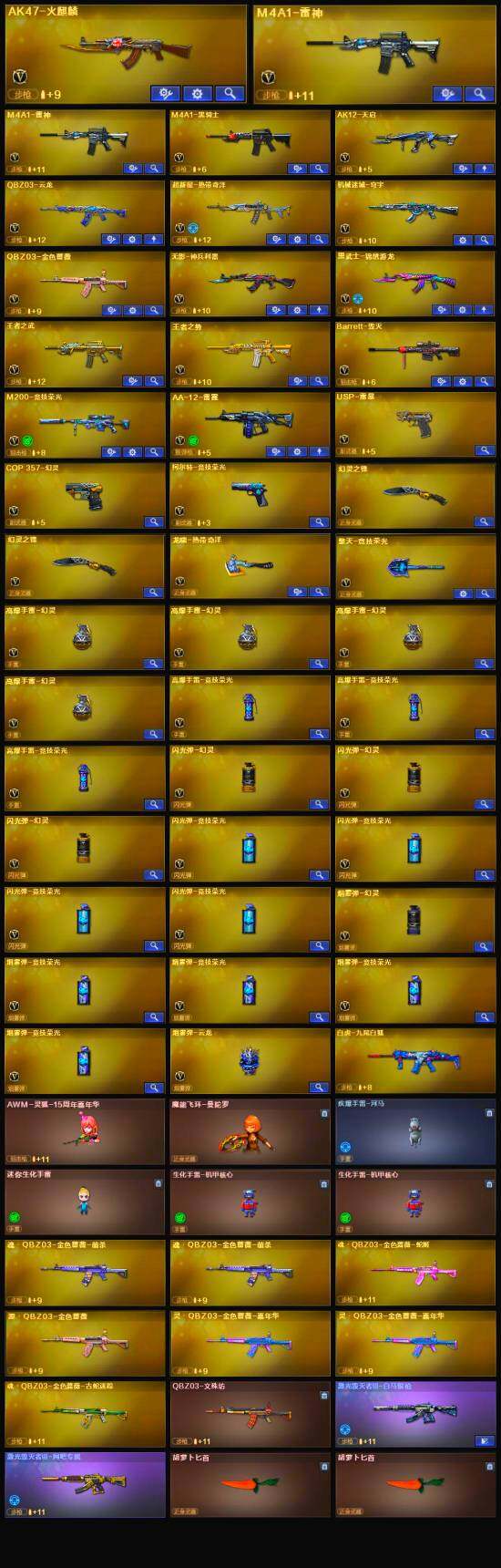 【英雄级武器】:AK47-火麒麟,M4A1-雷神*2,M4A1-黑骑士,AK12-天启,无影-神兵利器,QBZ03-云龙,黑武士-锦绣游龙,超新星-热带奇洋,QBZ03-金色蔷薇,王者之武-觉醒版,王者之势-觉醒版,Barrett-毁灭,M200-竞技荣光,AA-12-雷霆,USP-雷暴,COP 357-幻灵,柯尔特-竞技荣光,幻灵之锋*2,擎天-竞技荣光,龙啸-热带奇洋,高爆手雷-幻灵*4,高爆手雷-竞技荣光*3,手雷-热带奇洋,闪光弹-幻灵*3,闪光弹-竞技荣光*4,烟雾弹-幻灵,烟雾弹-竞技荣光*4,烟雾弹-云龙,M4A1-赤狱骑士