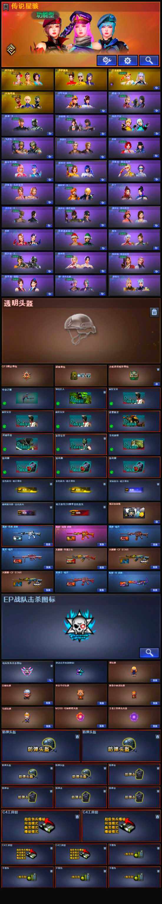 【道具】:CFS限定背包,云山科技背包,亚洲杯纪念炫彩背包,全能枪王背包,古蛇迷踪炫彩背包,奇洋探员-海龟背包,炫彩背包,热带奇洋炫彩背包,超级背包,女皇终结者-魔龙之吻,救世主-黑桃战神,绿色巨人,灵魂忍者,变异宝贝,迷雾幽灵,生化弹匣,夺命之镰,防化服*3,金色流光-枪王排位*2,星辰流光-枪王排位,巅峰赛先锋-金色流光,枪王排位28赛季金色流光,枪王排位29赛季金色流光,热带奇洋表情,斯沃特表情,EP战队名片,EP战队喷图,EP战队击杀图标,C4-红龙,防弹头盔*4,防弹衣*4,C4工具钳*4,手雷包*4