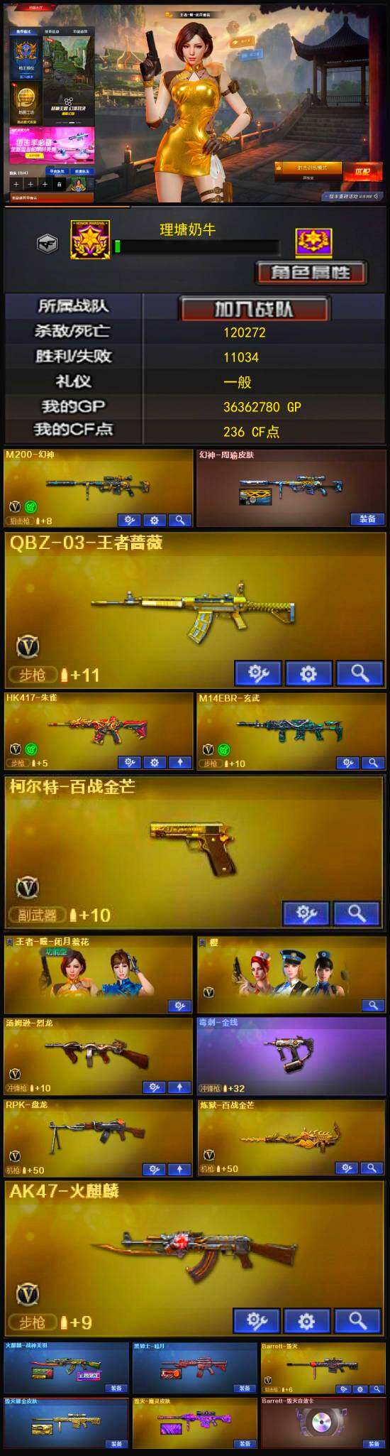 - [13555486]广西一区-20V-4王者-2炫金 【热门武器】:QBZ03-金色蔷薇,M200-幻神,死亡之眼,M4A1-黑骑士,汤姆逊-烈龙*5,沙鹰-修罗 【王者炫金武器】:王者之心,王者之怒,王者之锋,炫金黑龙,炫金雷神 【音效卡】:Barrett-碧霄极光音效卡 【皮肤】:雷神-能量核心,火麒麟-雷神 【角色】:狐影 【人偶武器】:火麒麟-灵狐 【暴走生化】:死亡之眼,超级对讲机 【挑战大师】:冰龙粉碎者-白马银枪 【英雄级武器】:AK47-火麒麟,M4A1-黑骑士,AK47-黑鲨,M4A1-玫瑰精灵,QBZ03-金色蔷薇,AWM-裁决,M200-幻神,汤姆逊-烈龙*5,沙鹰-修罗,沙鹰-天神*2,屠龙*2,龙啸,M4A1-赤狱骑士,Barrett-碧霄极光 【特殊枪械】:1黑骑士,5烈龙