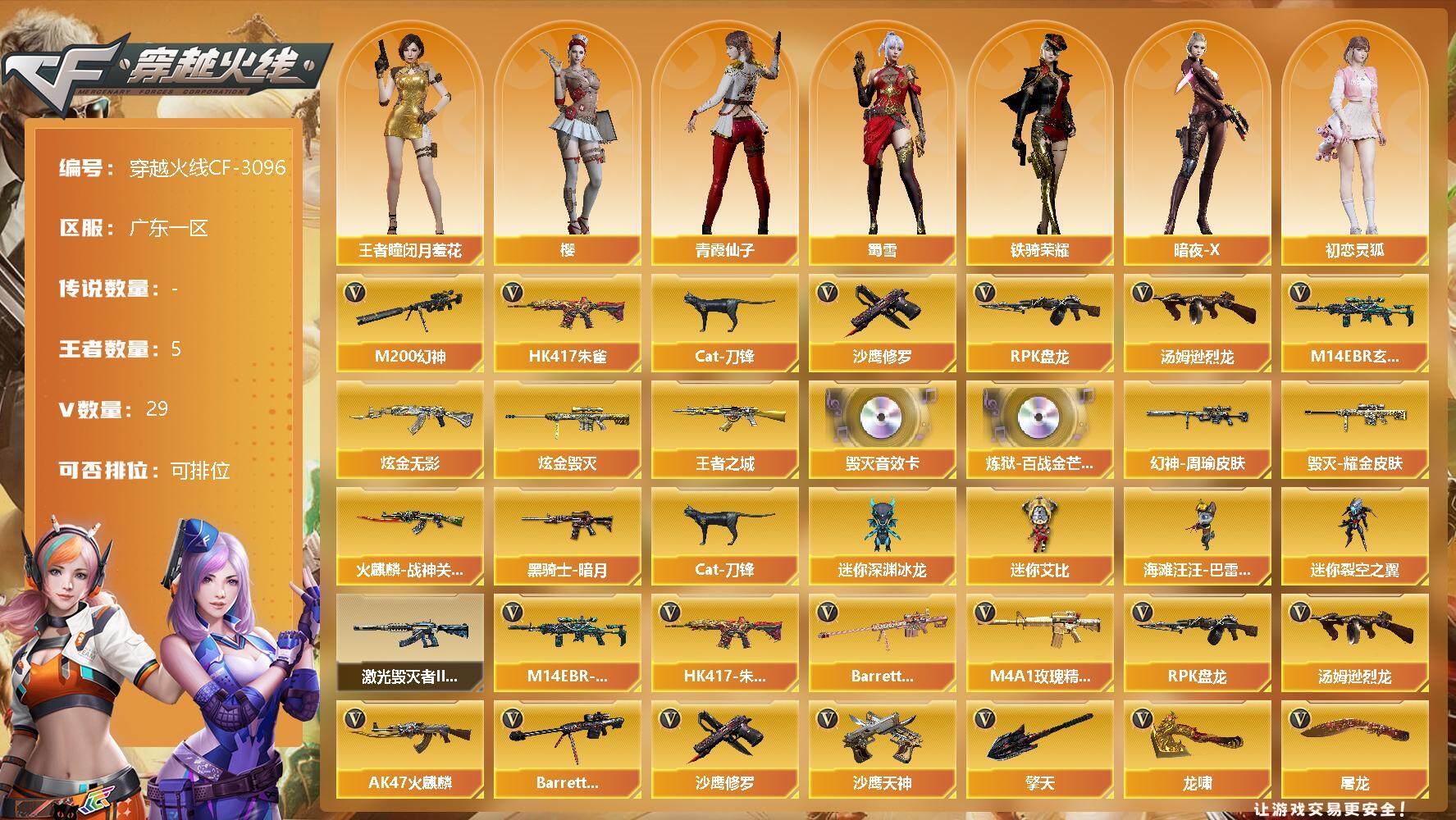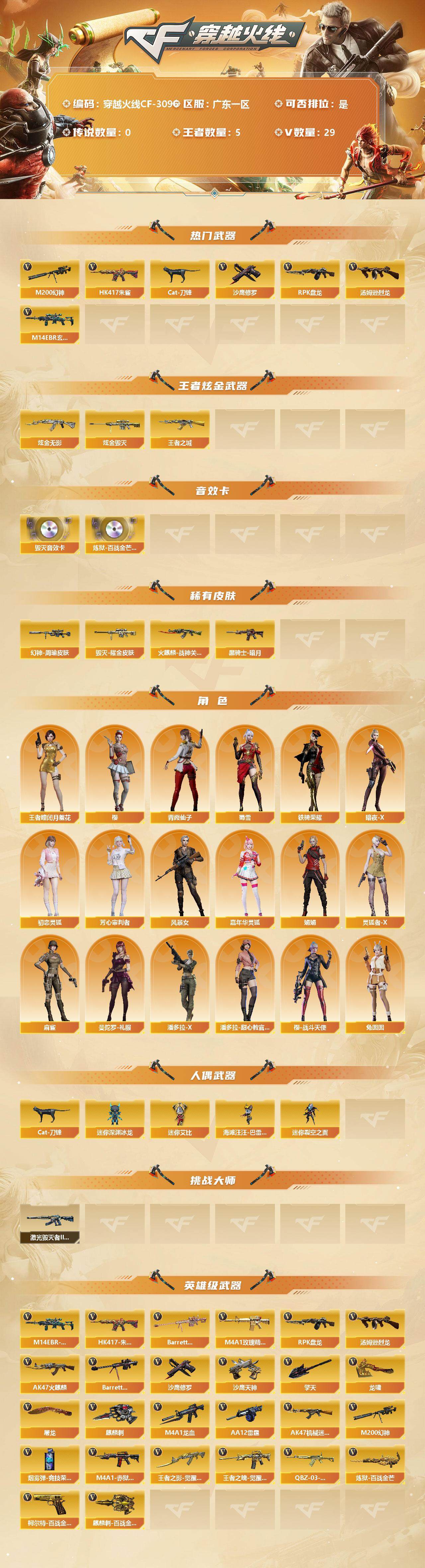 [13140356]广东一区-29V-5王者-2炫金 【热门武器】:M14EBR-玄武,HK417-朱雀,M200-幻神,Cat-刀锋,汤姆逊-烈龙,RPK-盘龙,沙鹰-修罗 【王者炫金武器】:王者之城,炫金无影,炫金毁灭 【音效卡】:Barrett-毁灭音效卡,炼狱-百战金芒-庆典舞曲音效卡 【皮肤】:幻神-周瑜皮肤,M4A1-再燃火线,火麒麟-战神关羽,毁灭耀金皮肤,毁灭-魔灵皮肤,黑骑士-暗月,死神-秘银*2,战神-流金岁月皮肤,轻型军用手斧-再燃火线 【角色】:樱,王者-瞳-闭月羞花,暗夜-X,初恋灵狐,芳心审判者,风暴女,嘉年华灵狐,娟娟,灵狐者-X,麻雀,曼陀罗-礼服,潘多拉-X,潘多拉-甜心教官,青霞仙子,蜀雪,铁骑荣耀,兔囡囡,樱-战斗天使 【人偶武器】:海滩汪汪-巴雷特,Cat-刀锋,迷你艾比,迷你深渊冰龙,迷你裂空之翼 【挑战大师】:激光毁灭者III-白马银枪*2 【英雄级武器】:AK47-火麒麟,AK47-机械迷城,M4A1-龙血,HK417-朱雀,M14EBR-玄武,M4A1-玫瑰精灵,王者之影-觉醒版,王者之魄-觉醒版,QBZ-03-王者蔷薇-觉醒版,Barrett-毁灭,M200-幻神,Barrett-金色蔷薇,RPK-盘龙,炼狱-百战金芒,汤姆逊-烈龙,AA-12-雷霆,沙鹰-修罗,沙鹰-天神*3,柯尔特-百战金芒,屠龙*2,龙啸,擎天,麒麟刺,麒麟刺-百战金芒,烟雾弹-竞技荣光,M4A1-赤狱骑士 【特殊枪械】:1烈龙,1盘龙