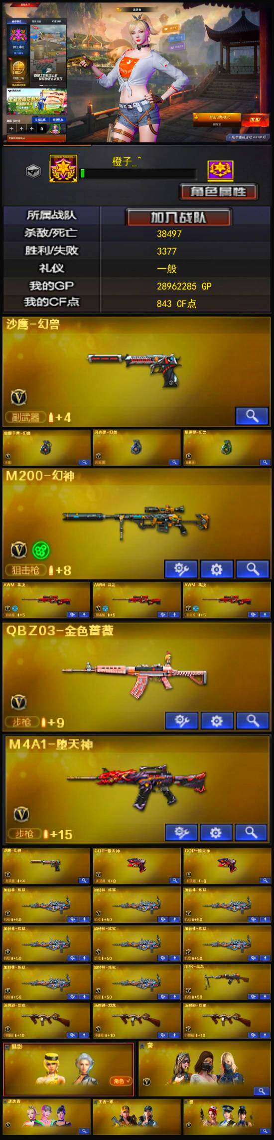 【热门武器】:QBZ03-金色蔷薇,M200-幻神,金色小号,M4A1-黑骑士,汤姆逊-烈龙*3,RPK-盘龙,加特林-炼狱*8,COP-堕天神*2,沙鹰-修罗*5,高爆手雷-幻兽