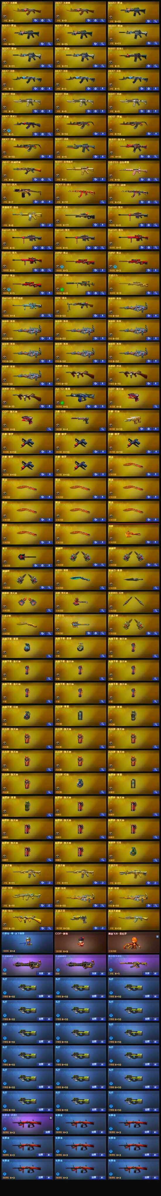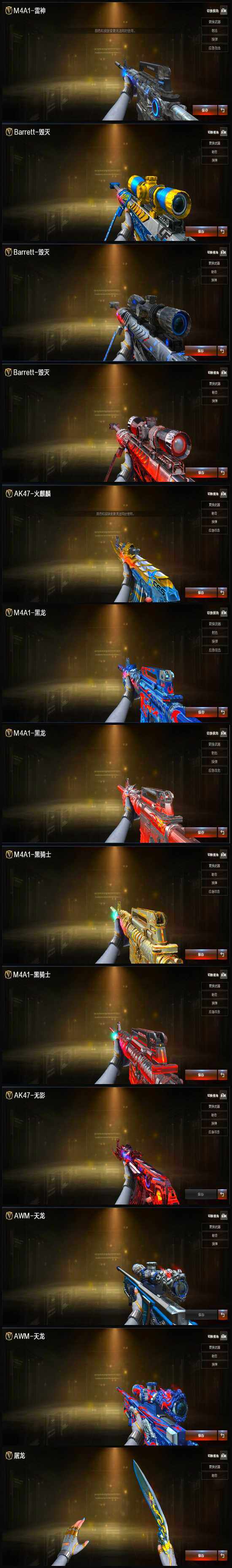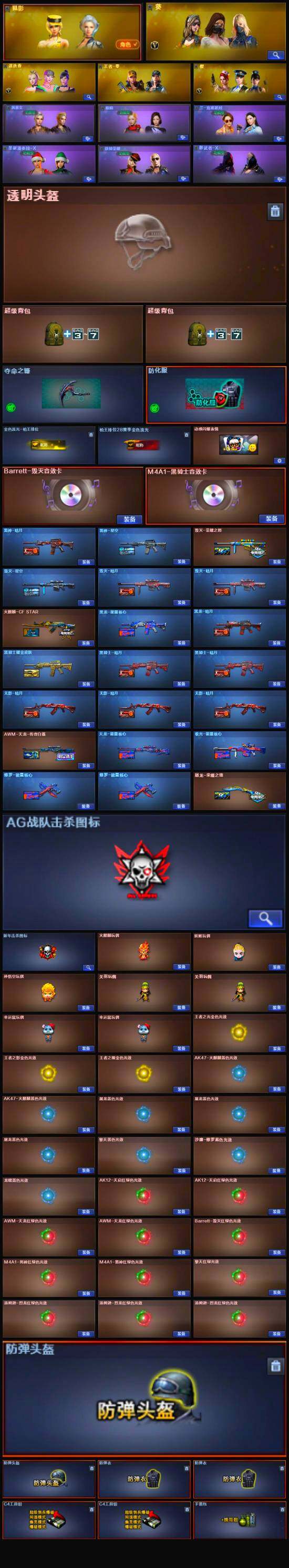 【英雄级武器】:AK47-火麒麟*2,M4A1-黑龙*3,M4A1-雷神*3,M4A1-黑骑士,AK47-无影*3,M4A1-死神*3,AK47-黑武士,AK47-机械迷城,AK47-黑鲨*3,M4A1-龙血,M4A1-堕天神,M4A1-玫瑰精灵,QBZ03-金色蔷薇,AK-47-猩红传说*3,AK47-B-战神,AWM-天龙,Barrett-毁灭*3,Barrett-极光*2,AWM-裁决*3,M200-幻神,王者之力-觉醒版,RPK-盘龙,加特林-炼狱*8,汤姆逊-烈龙*3,AA-12-雷霆,沙鹰-修罗*5,沙鹰-天神,COP-堕天神*2,沙鹰-幻兽,屠龙*9,龙啸,麒麟刺-堕天神,擎天,麒麟刺*3,龙啸-堕天神,斩神刀-雷暴,女皇利刃-幻兽,王者之锋-觉醒版,王者之击-觉醒版,王者之刺-觉醒版,高爆手雷-雷霆,高爆手雷-幻兽,高爆手雷-雷暴,高爆手雷-堕天神*7,闪光弹-雷霆,闪光弹-幻兽,闪光弹-雷暴,闪光弹-堕天神*7,烟雾弹-雷霆,烟雾弹-幻兽,烟雾弹-雷暴,烟雾弹-堕天神*7