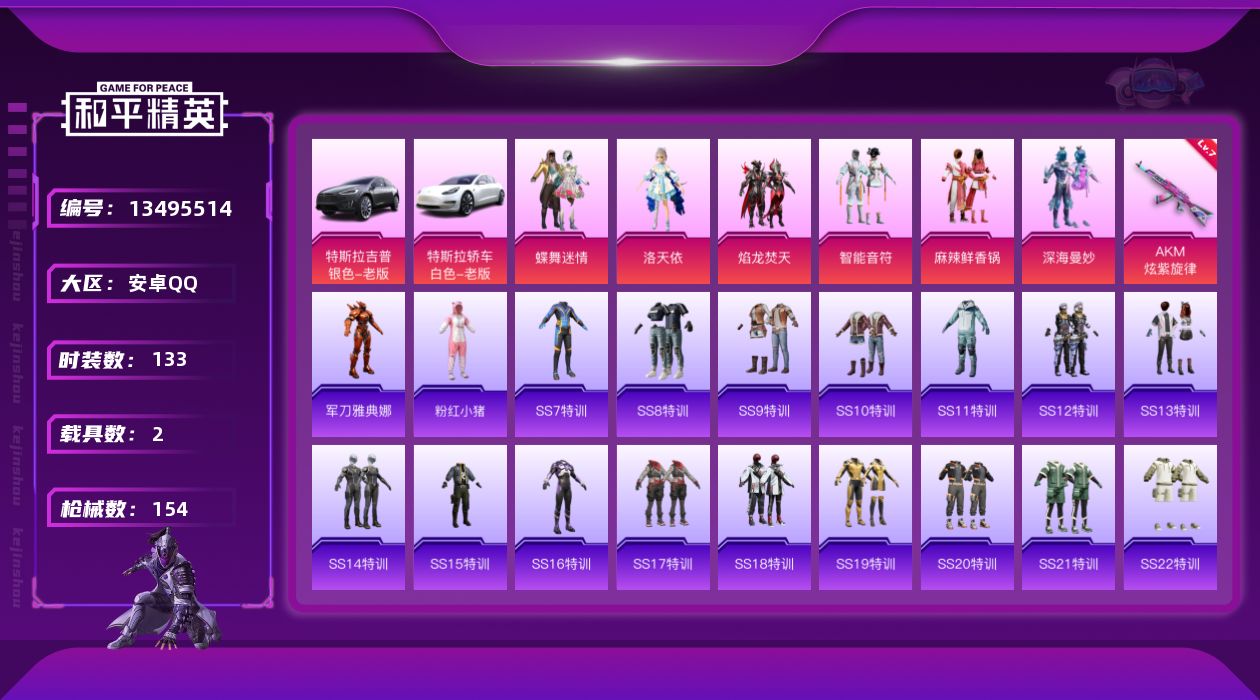 [13495514]可二次【店主推荐捡漏号!可直接换绑】 安卓 手Q-6粉装-1特效枪-2载具-2粉色飞行器-5.3w热力值-11王牌印记-133套装-154枪皮【热门品类】:套装-深海小丑鱼,角色-军刀雅典娜,套装-潮萌小黄鸭,套装-浪漫波比,套装-粉红小猪【粉色载具】:特斯拉Model 3(珍珠白),特斯拉Model X(冷光银)【粉色套装】:粉装-深海曼妙,粉装-蝶舞迷情,粉装-麻辣鲜香锅,粉装-智能音符,粉装-焰龙焚天,角色-洛天依【粉色枪皮等级】:AKM-炫紫旋律(七级)【粉色飞行器】:炫紫旋律飞行器,古堡领主飞行器