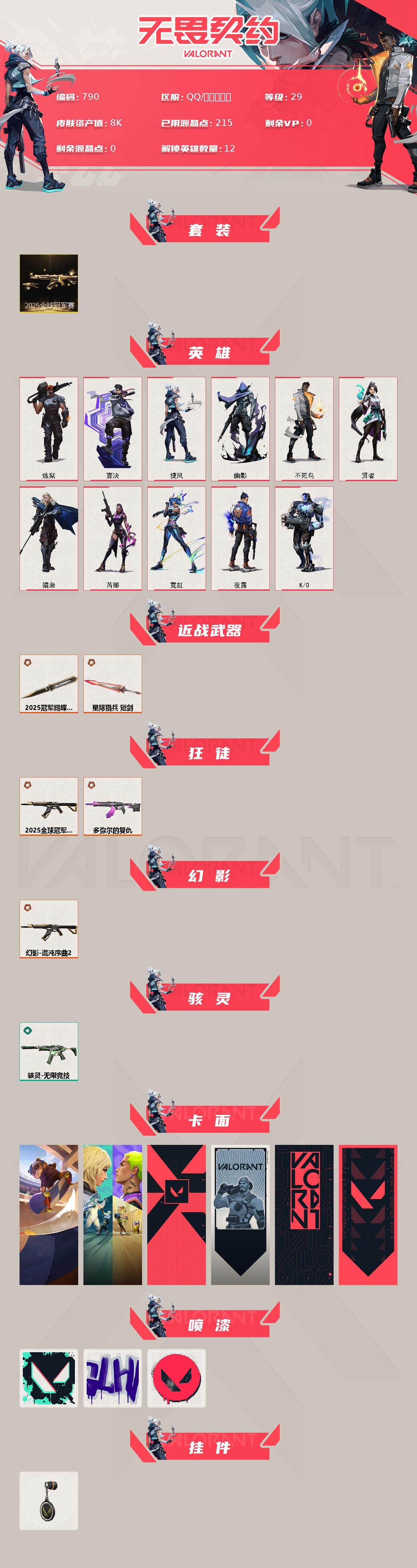 [13498914]【套装】:2025全球冠军赛套装 【英雄】:炼狱,壹决,捷风,幽影,不死鸟,贤者,猎枭,芮娜,霓虹,夜露,K/O 【近战 武器】:近战武器-2025全球冠军赛 蝴蝶刀,近战武器-星际猎兵 短剑 【狂徒】:狂徒-2025全球冠军赛,狂徒-多弥尔的复仇 【幻影】:幻影-混沌序曲//2.0 【骇灵】:骇灵-无限竞技 【卡面】:Clutch 卡面,钢锁vs盖可 卡面,代号红色 卡面,新兵报到 卡面,V契约 卡面,无畏契约 卡面 【喷漆】:胜利属于无畏契约 喷漆,GLHF 喷漆,无畏契约 喷漆 【挂饰】:无畏契约 纪念币 挂饰