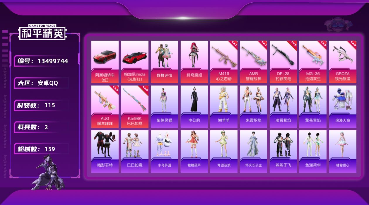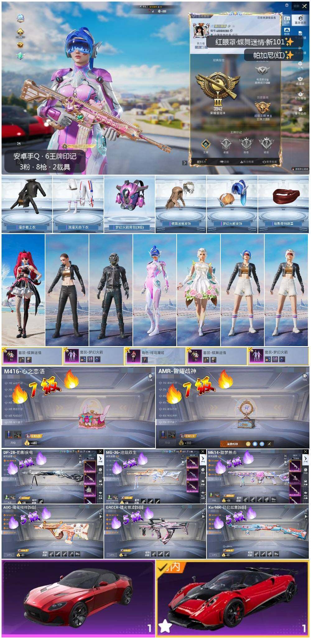 - [12654062]素材身法号 安卓 手Q-1神装-3粉装-1特效枪-3载具-1粉色飞行器-2.2w热力值-2王牌印记-41套装-49枪皮【红色神装等级】:宇宙意志-塞卢姆(二级)【热门品类】:粉装-梦幻火箭,套装-粉红小猪,角色-Mark.06【粉色载具】:兰博基尼Estoque(银翼灰),合金龙骨(蓝),星梦玉骢【粉色套装】:粉装-梦幻火箭,粉装-冰川幽秘,角色-星梦奇缘【粉色枪皮等级】:UMP45-宇宙意志(四级)【粉色飞行器】:深渊漩涡飞行器
