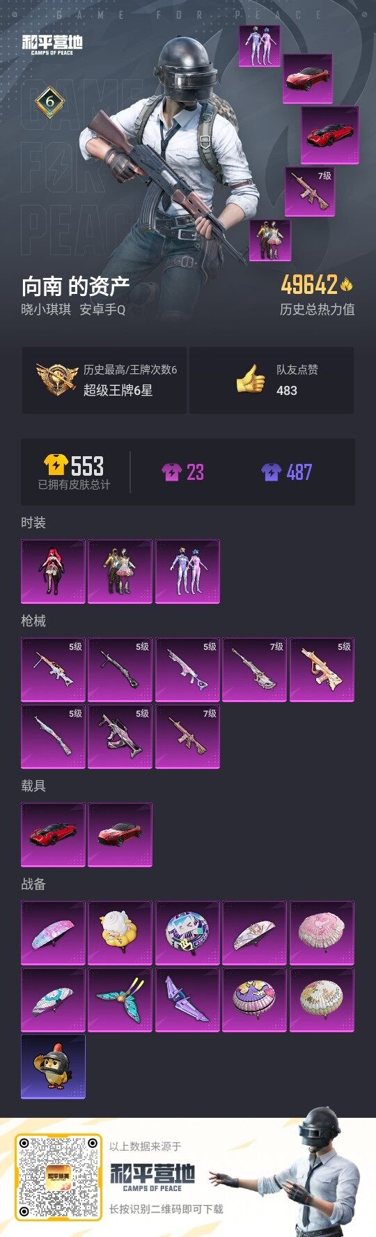 - PX_2074753- 安卓手Q-17王牌印记-5粉装-11特效枪-2载具-76283热力值-132套装-236枪皮-2卓越印记-0传奇印记 【5粉装】,罗征,智耀战神,炙焰牛王,数码大师,烟云彩露 【11特效枪】AKM-炫紫旋律-4级 AKM-梦之光华-7级 SCAR-L-时空协奏-3级 SCAR-L-锦绣绵绵-5级 M416-心之恋语-5级 M416-五爪金龙-5级 M416-电玩时刻-5级