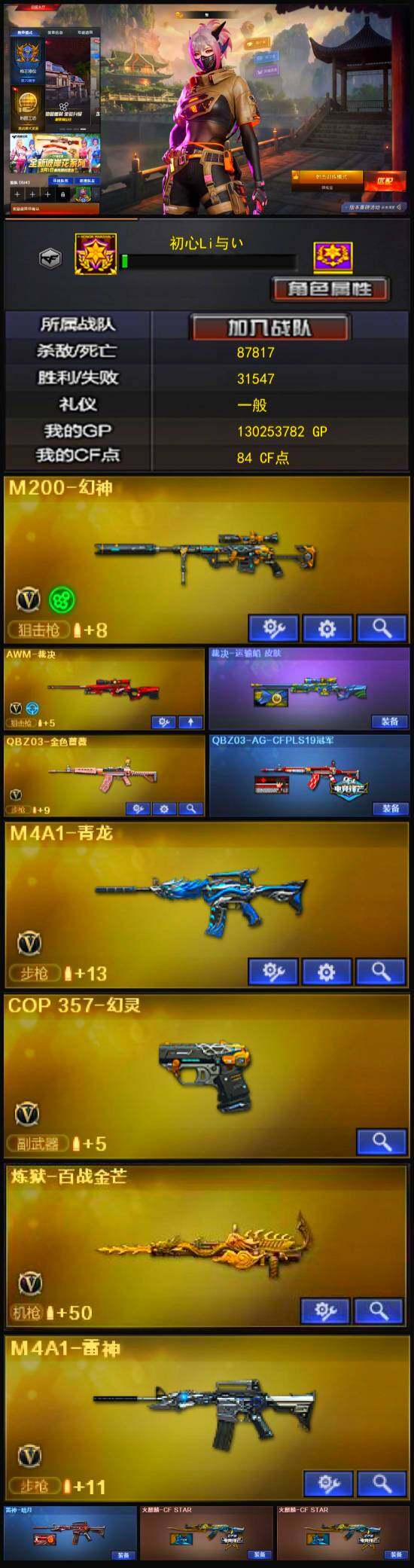 【热门武器】:QBZ03-金色蔷薇,M4A1-青龙,M200-幻神,金色蔷薇-古蛇迷踪,修罗-古蛇迷踪,COP 357-幻灵,沙鹰-修罗*3