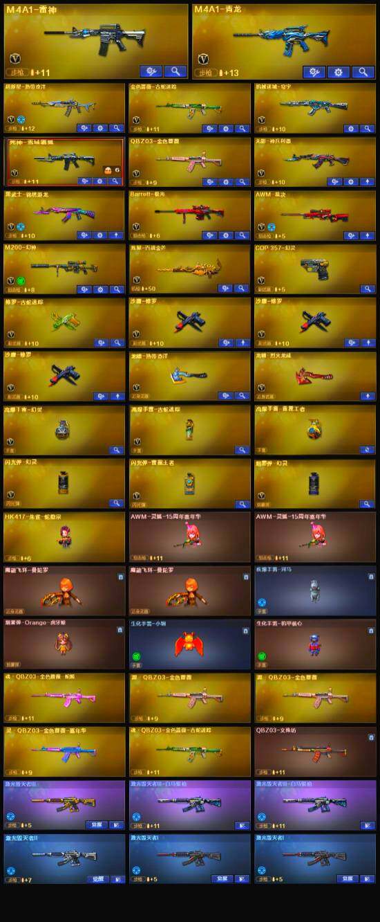 【英雄级武器】:M4A1-雷神,M4A1-青龙,无影-神兵利器,黑武士-锦绣游龙,超新星-热带奇洋,金色蔷薇-古蛇迷踪,死神-雪域霜狐,QBZ03-金色蔷薇,Barrett-极光,AWM-裁决,M200-幻神,炼狱-百战金芒,沙鹰-修罗*3,COP 357-幻灵,修罗-古蛇迷踪,龙啸-热带奇洋,麒麟刺-百战金芒,高爆手雷-幻灵,手雷-热带奇洋,高爆手雷-古蛇迷踪,高爆手雷-雷霆王者,闪光弹-幻灵,烟雾弹-幻灵,烟雾弹-古蛇迷踪,M4A1-赤狱骑士,AWM-昌龙,Barrett-碧霄极光
