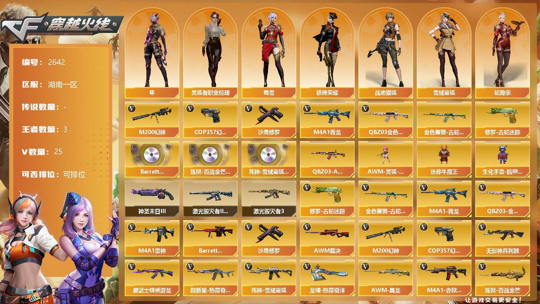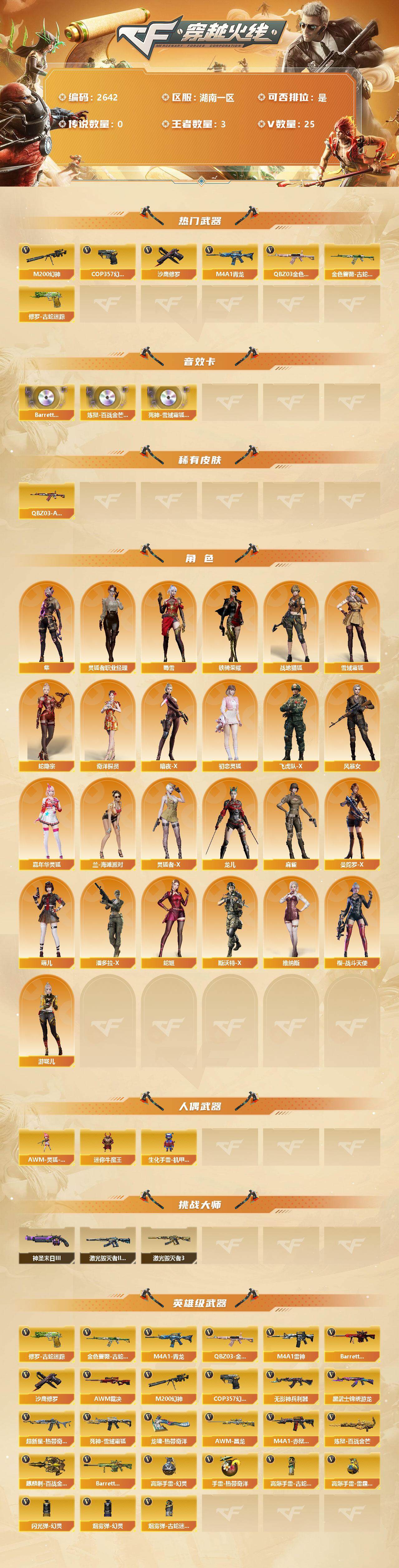[13228216]湖南一区-25V-3王者-0炫金 【热门武器】:QBZ03-金色蔷薇,M4A1-青龙,M200-幻神,金色蔷薇-古蛇迷踪,修罗-古蛇迷踪,COP 357-幻灵,沙鹰-修罗*3 【音效卡】:Barrett-碧霄极光音效卡,炼狱-百战金芒-庆典舞曲音效卡,死神-雪域霜狐-怀旧音效卡 【皮肤】:QBZ03-AG-CFPLS19冠军,裁决-运输船 皮肤,雷神-暗月,M4A1-再燃火线,轻型军用手斧-再燃火线 【角色】:隼,战地猎狐,雪域霜狐,蛇隐宗,奇洋探员,暗夜-X,初恋灵狐,飞虎队-X,风暴女,嘉年华灵狐,兰-海滩派对,灵狐者-X,灵狐者-职业经理,龙儿,麻雀,曼陀罗-X,萌儿,潘多拉-X,蛇姬,斯沃特-X,蜀雪,铁骑荣耀,维纳斯,樱-战斗天使,游珑儿 【人偶武器】:AWM-灵狐-15周年嘉年华*2,迷你牛魔王,生化手雷-机甲核心 【挑战大师】:激光毁灭者III-白马银枪*2,激光毁灭者III,神圣爆裂者-末日III 【英雄级武器】:M4A1-雷神,M4A1-青龙,无影-神兵利器,黑武士-锦绣游龙,超新星-热带奇洋,金色蔷薇-古蛇迷踪,死神-雪域霜狐,QBZ03-金色蔷薇,Barrett-极光,AWM-裁决,M200-幻神,炼狱-百战金芒,沙鹰-修罗*3,COP 357-幻灵,修罗-古蛇迷踪,龙啸-热带奇洋,麒麟刺-百战金芒,高爆手雷-幻灵,手雷-热带奇洋,高爆手雷-古蛇迷踪,高爆手雷-雷霆王者,闪光弹-幻灵,烟雾弹-幻灵,烟雾弹-古蛇迷踪,M4A1-赤狱骑士,AWM-昌龙,Barrett-碧霄极光 【特殊枪械】: