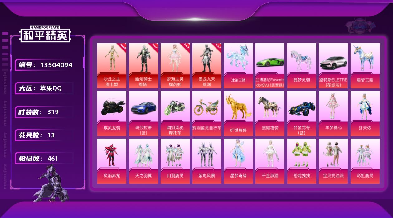 [13504094]素材身法号/绝世印记2/扭蛋碎片1100/璀璨碎片625【特价急出/详情看图】:苹果 手Q-4神装-46粉装-29特效枪-13载具-29粉色飞行器-18.4w热力值-21王牌印记-319套装-461枪皮【红色神装等级】:幽焰骑士-维塔(一级),梦海之灵-妮芮妲(一级),墨龙九天-敖渊(一级),沙丘之主-图卡盟(二级)【热门品类】:粉装-梦幻火箭,粉装-缤纷油彩,套装-奇异狩猎者,角色-军刀雅典娜,套装-六号树人,套装-龟仙人,套装-暗影哥特,套装-浪漫波比,套装-粉红小猪,角色-8号机,角色-Mark.06【粉色载具】:兰博基尼Aventador SVJ(翡翠绿),路特斯ELETRE(花绽灰),玛莎拉蒂Ghibli(蓝),合金龙骨(蓝),疾风龙骑,幽焰风驰摩托车,僚机-萌兔起飞,星梦玉骢,护世瑞兽,晶梦灵驹,黑曜夜骑,冰绡玉鳞,辉羽雀灵自行车【粉色套装】:粉装-深渊皇后,粉装-宝贝奶油派,粉装-梦幻火箭,粉装-缤纷油彩,粉装-冰霜白皇,粉装-炙焰红王,粉装-炙焰赤龙,粉装-飓风飞鹰,粉装-蜜桃特工,粉装-蝶舞蔷薇,粉装-彩虹鹿灵,粉装-山涧鹿灵,角色-洛天依,粉装-黄伞悠悠,粉装-黑伞漫漫,粉装-天之羽翼,粉装-薄荷物语,粉装-恐龙拽拽,粉装-绚丽摇曳,粉装-冷魅冰骑,粉装-赤焰黑爵,粉装-紫电风暴,粉装-甜梦小狐,粉装-星夜魔法师,角色-复仇流浪者,粉装-纯珍童话,角色-万古烈焰,角色-宙之时溯,角色-星云暗核,粉装-傲傲奶龙,角色-烟云彩露,角色-小蓝,角色-美琪,角色-超弦星,角色-鸢尾晶梦,角色-星梦奇缘,角色-千金淑猫,粉装-牡丹亭·游园,粉装-幻梦之森,角色-樱桃泡泡,角色-智耀战神,角色-幻海仙踪,角色-时光之吻,角色-狂魅哈莉,角色-冷漠罗丽,角色-羊梦糖心【粉色枪皮等级】:AKM-炫紫旋律(五级),AKM-梦之光华(五级),AKM-幽焰骑士(三级),SCAR-L-童趣迷兔(七级),SCAR-L-金蛇镇世(三级),M416-五爪金龙(七级),M416-心之恋语(四级),M416-风花雪月(五级),M416-电玩时刻(五级),M416-墨龙九天(三级),M416-灵猫魔法师(三级),GROZA-精灵之光(三级),AUG-许七安(四级),M762-激战未来(四级),UZI-筑梦精灵(四级),UMP45-量子极限(五级),AKS-74U-信仰神谕(四级)