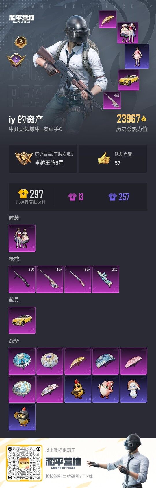 [13231046]安卓 手Q-1粉装-4特效枪-1载具-2.3w热力值-3王牌印记-46套装-84枪皮【粉色载具】:兰博基尼URUS(明艳黄)【粉色套装】:粉装-星穹咏叹调【粉色枪皮等级】:P90-金丰海韵(三级),Kar98K-巳巳如意(一级),AMR-智耀战神(四级),DP-28-豹影疾电(一级)
