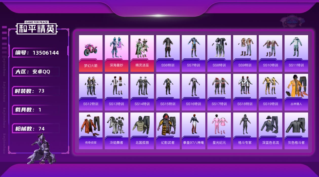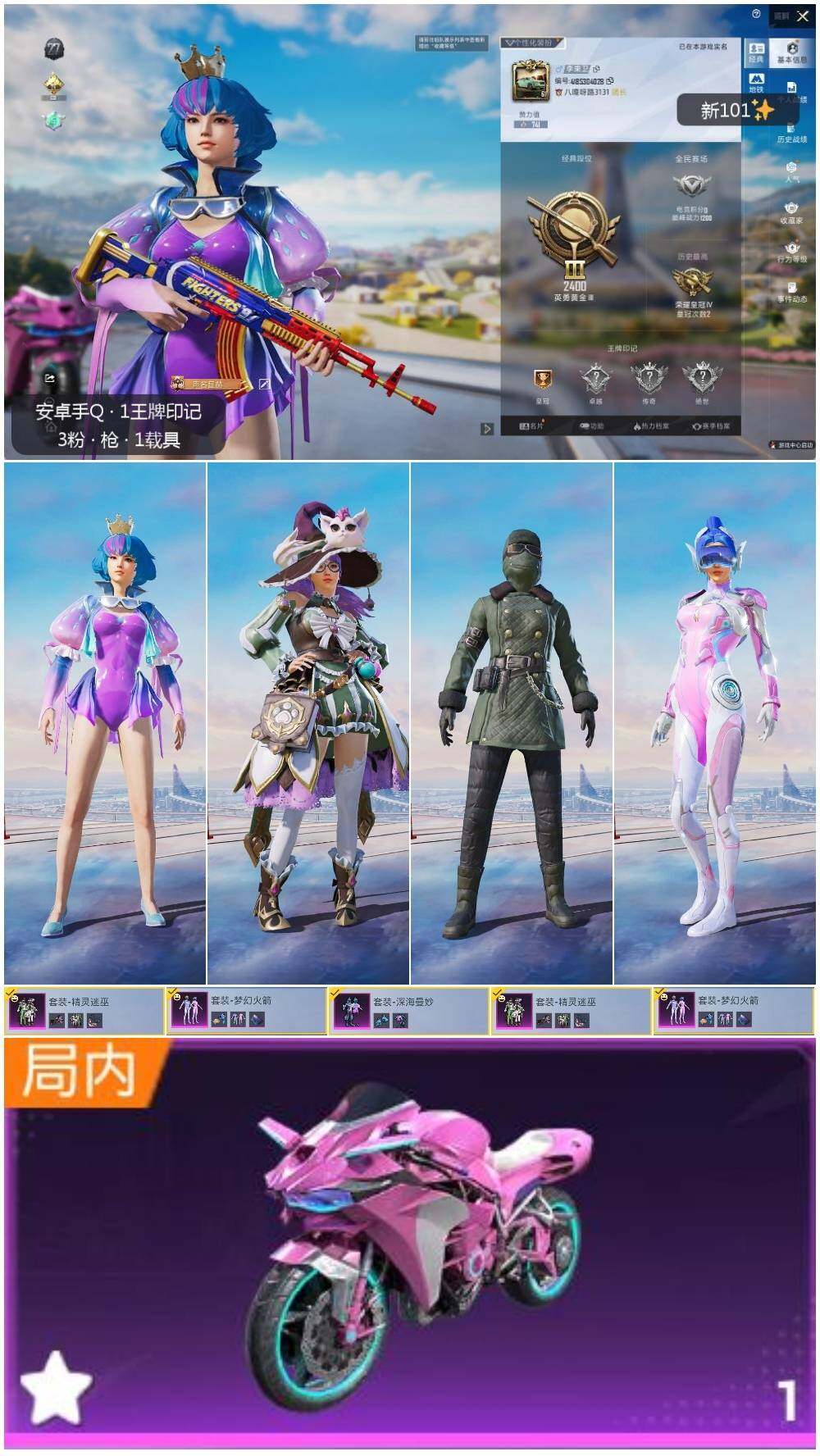 [13506144]【店主推荐捡漏号!可直接换绑】 安卓 手Q-3粉装-1载具-2粉色飞行器-3w热力值-1王牌印记-73套装-74枪皮【热门品类】:粉装-梦幻火箭【粉色载具】:双人摩托-梦幻火箭【粉色套装】:粉装-深海曼妙,粉装-精灵迷巫,粉装-梦幻火箭【粉色飞行器】:精灵迷巫飞行器,梦幻火箭飞行器
