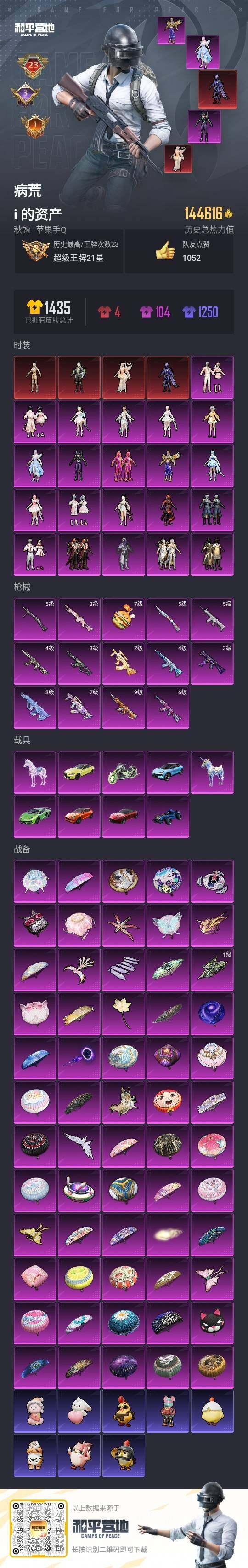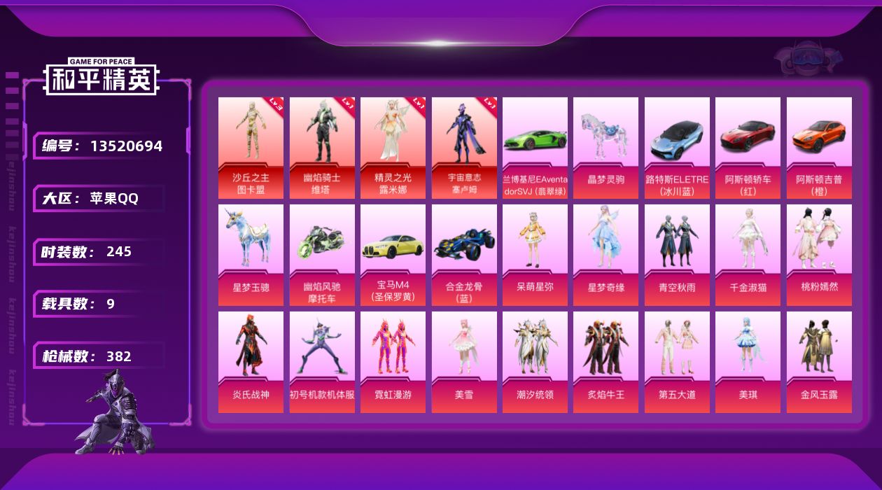 - PX_2091758-苹果Q【可二次】114597热力值 16王牌印记 历史无敌战神 244套装 297枪皮《极品女号 金迪迦 都市 赤蝎 金鞋发光眼罩 小丑 雪国 小狐 巧克力 猪脸 雪国精灵》【3载具】 照夜玉狮子 星梦玉骢 萌兔起飞僚机 【8稀有】 赤蝎幽灵 M416-星际漫游 AKM-缤纷海域 SCAR-L-粉色回忆 都市猎人 浪漫天命 派对舞王 派对舞王(金靴子) 【30粉装】 梦幻火箭