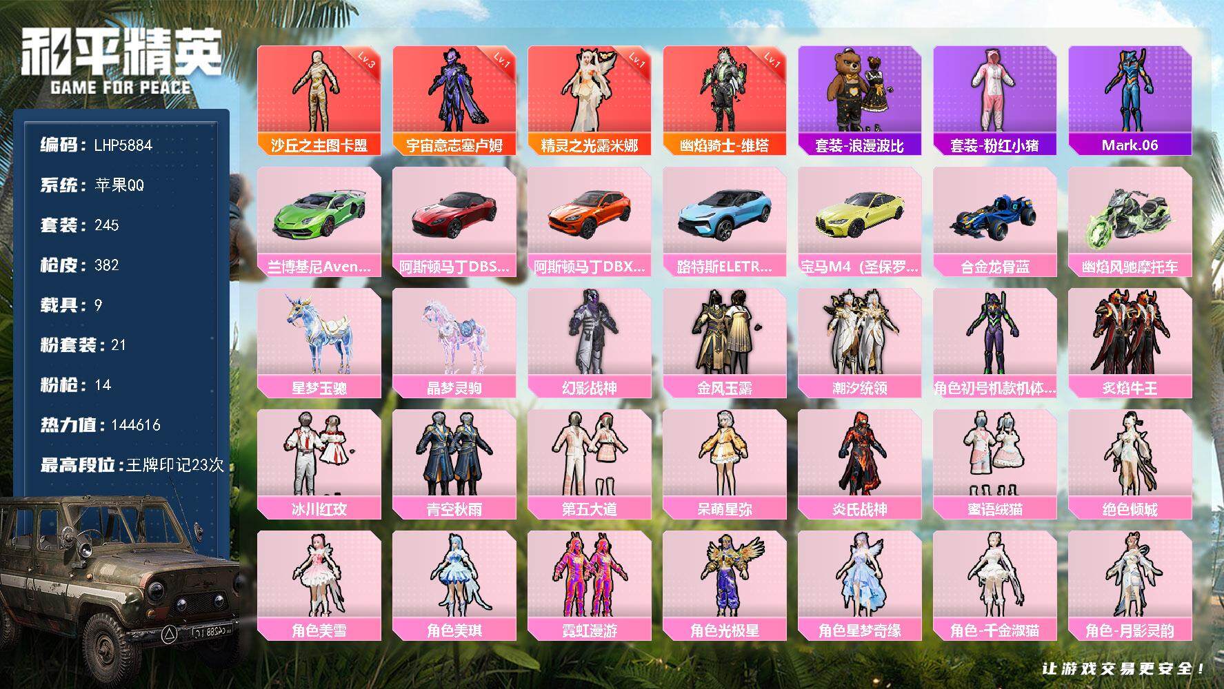 [13520694]可二次【店主推荐捡漏号!可直接换绑】/素材身法号/M416-至情至圣(九级)/地铁满天赋 苹果 手Q-4神装-21粉装-14特效枪-9载具-14粉色飞行器-14.4w热力值-23王牌印记-245套装-382枪皮【红色神装等级】:幽焰骑士-维塔(一级),精灵之光-露米娜(一级),宇宙意志-塞卢姆(一级),沙丘之主-图卡盟(三级)【热门品类】:套装-浪漫波比,套装-粉红小猪,角色-Mark.06【粉色载具】:兰博基尼Aventador SVJ(翡翠绿),阿斯顿马丁DBS(红),阿斯顿马丁DBX(橙),路特斯ELETRE(冰川蓝),宝马M4(圣保罗黄),合金龙骨(蓝),幽焰风驰摩托车,星梦玉骢,晶梦灵驹【粉色套装】:粉装-幻影战神,粉装-金风玉露,粉装-潮汐统领,角色-初号机款机体服,粉装-炙焰牛王,粉装-冰川红玫,粉装-青空秋雨,粉装-第五大道,角色-呆萌星弥,粉装-炎氏战神,粉装-蜜语绒猫,角色-绝色倾城,角色-美雪,角色-美琪,粉装-霓虹漫游,角色-光极星,角色-星梦奇缘,角色-千金淑猫,角色-月影灵韵,角色-晶梦幻蝶,粉装-桃粉嫣然【粉色枪皮等级】:AKM-炫紫旋律(六级),AKM-幽焰骑士(三级),SCAR-L-纯梦嫁纱(五级),M416-至情至圣(九级),GROZA-巴啦啦小魔仙(七级),GROZA-精灵之光(二级),AUG-星梦奇缘(三级),M762-冷魅冰骑(四级),UMP45-宇宙意志(三级),AKS-74U-信仰神谕(四级),Kar98K-巳巳如意(五级),Mk14-盛世惊鸿(三级),DP-28-豹影疾电(五级),破片手榴弹-热量炸弹(七级)【粉色飞行器】:心之恋语飞行翼,齐天大圣飞行器,庄周梦蝶飞行器,太空嘟嘟飞行器,镜光幻境飞行翼,镜域双华-灵镜之阶,绝色倾城飞行器,深渊漩涡飞行器,曦光华影飞行器,幽焰列车飞行器,凤舞九天飞行器,万象金身飞行器,幻星舰长飞行器