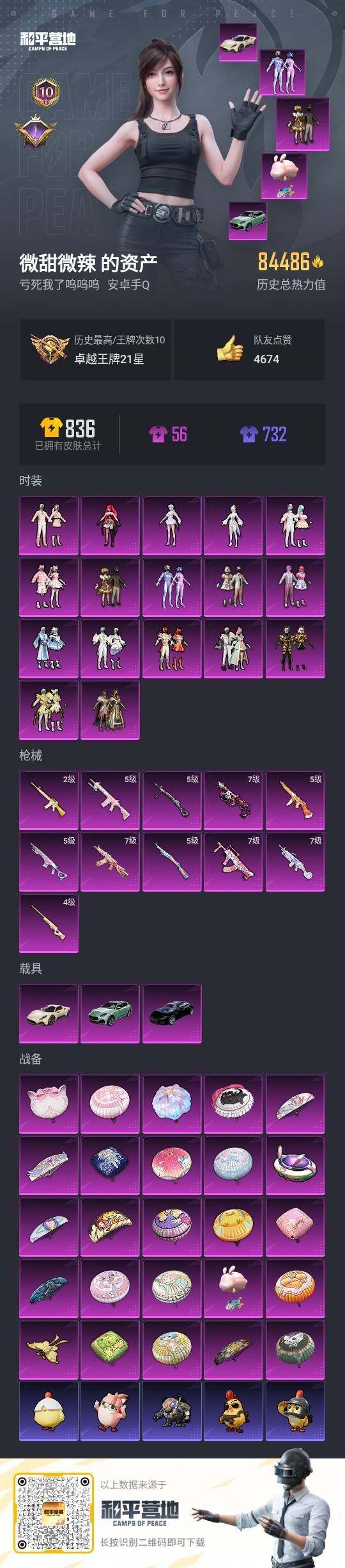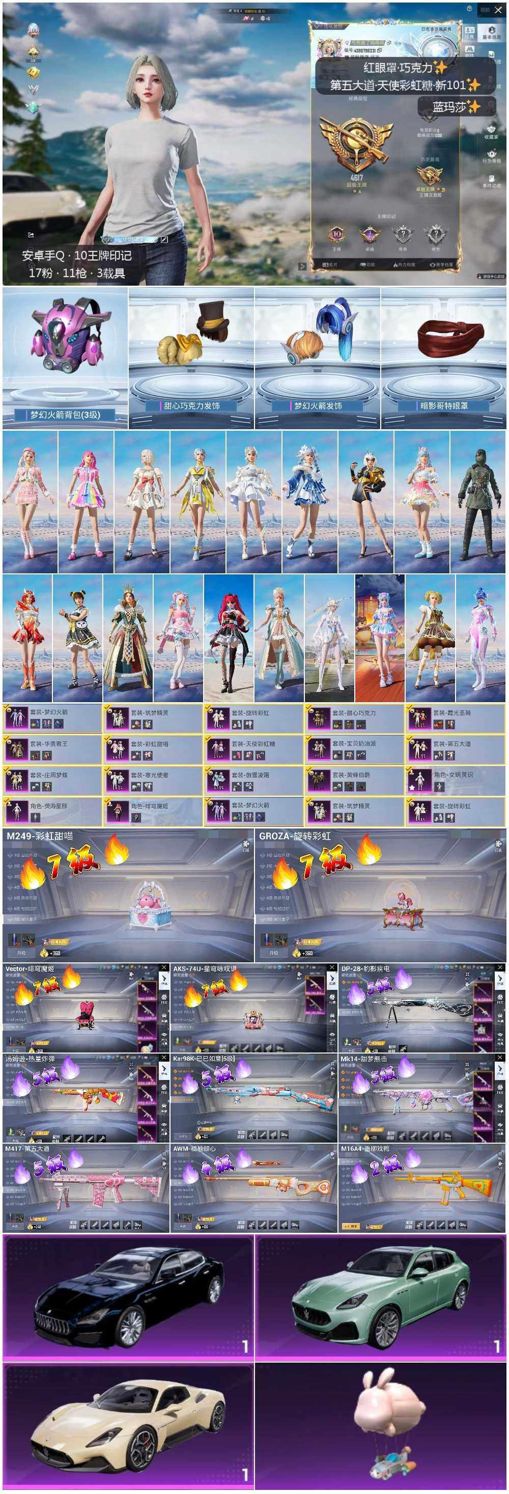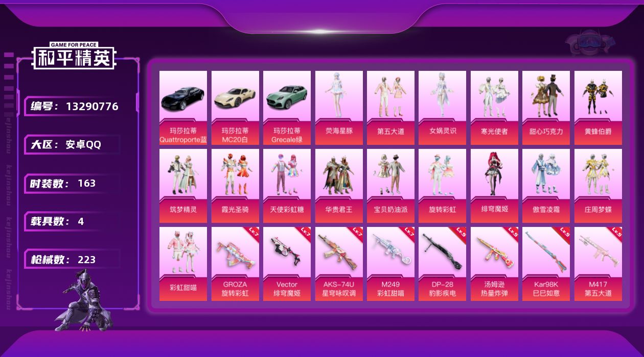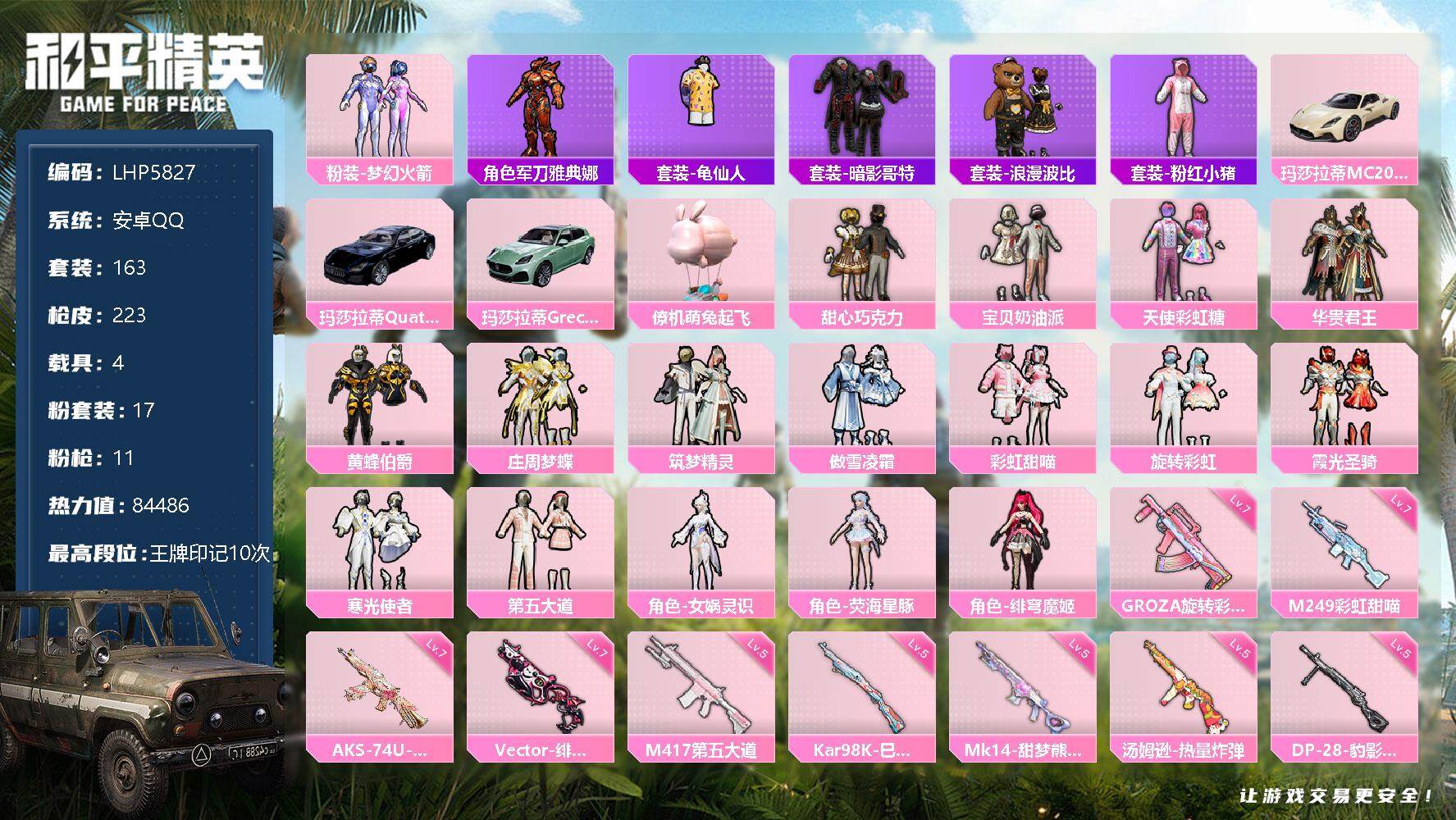 [13290776]女公主裙子号 素材身法号 安卓 手Q-17粉装-11特效枪-4载具-2粉色飞行器-8.4w热力值-10王牌印记-163套装-223枪皮【热门品类】:粉装-梦幻火箭,角色-军刀雅典娜,套装-龟仙人,套装-暗影哥特,套装-浪漫波比,套装-粉红小猪【粉色载具】:玛莎拉蒂MC20(星石白),玛莎拉蒂Quattroporte(夜幕蓝),玛莎拉蒂Grecale(薄荷绿),僚机-萌兔起飞【粉色套装】:粉装-甜心巧克力,粉装-宝贝奶油派,粉装-天使彩虹糖,粉装-梦幻火箭,粉装-华贵君王,粉装-黄蜂伯爵,粉装-庄周梦蝶,粉装-筑梦精灵,粉装-傲雪凌霜,粉装-彩虹甜喵,粉装-旋转彩虹,粉装-霞光圣骑,粉装-寒光使者,粉装-第五大道,角色-女娲灵识,角色-荧海星豚,角色-绯穹魔姬【粉色枪皮等级】:M16A4-垂柳戏鸭(二级),GROZA-旋转彩虹(七级),Vector-绯穹魔姬(七级),汤姆逊-热量炸弹(五级),AKS-74U-星穹咏叹调(七级),Kar98K-巳巳如意(五级),AWM-橘柚倾心(四级),Mk14-甜梦熊击(五级),M417-第五大道(五级),M249-彩虹甜喵(七级),DP-28-豹影疾电(五级)【粉色飞行器】:庄周梦蝶飞行器,太空嘟嘟飞行器