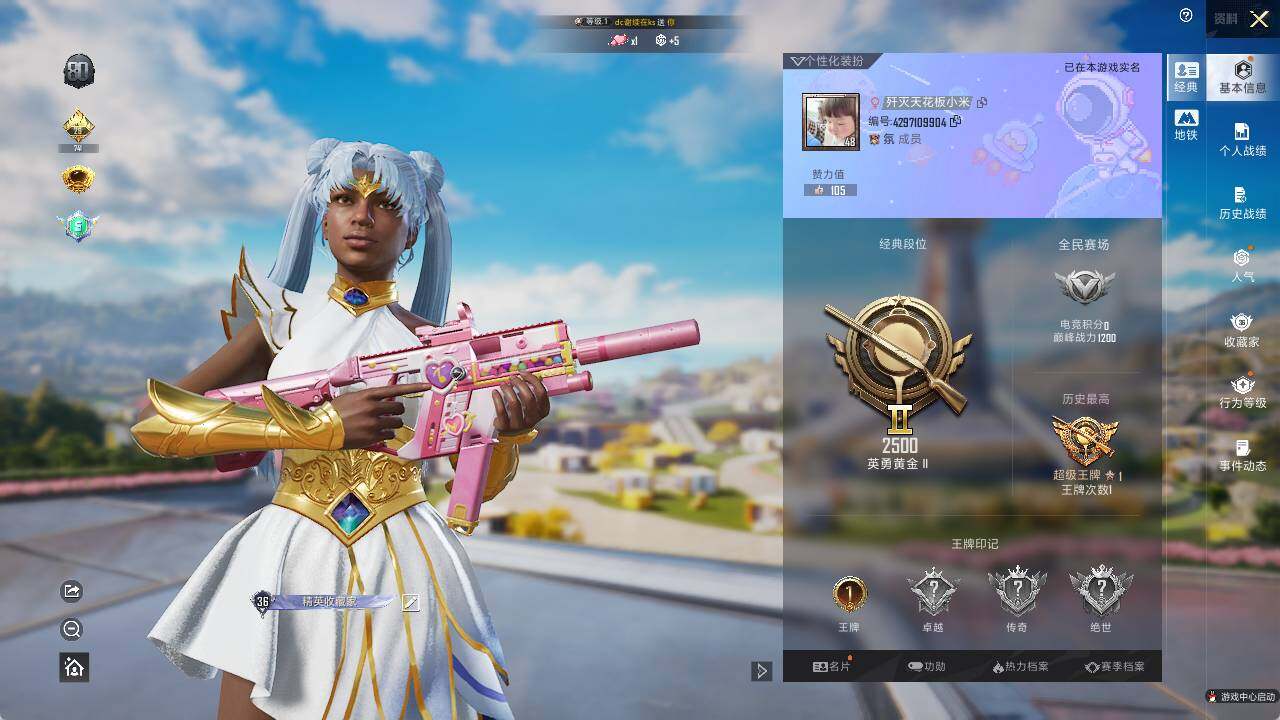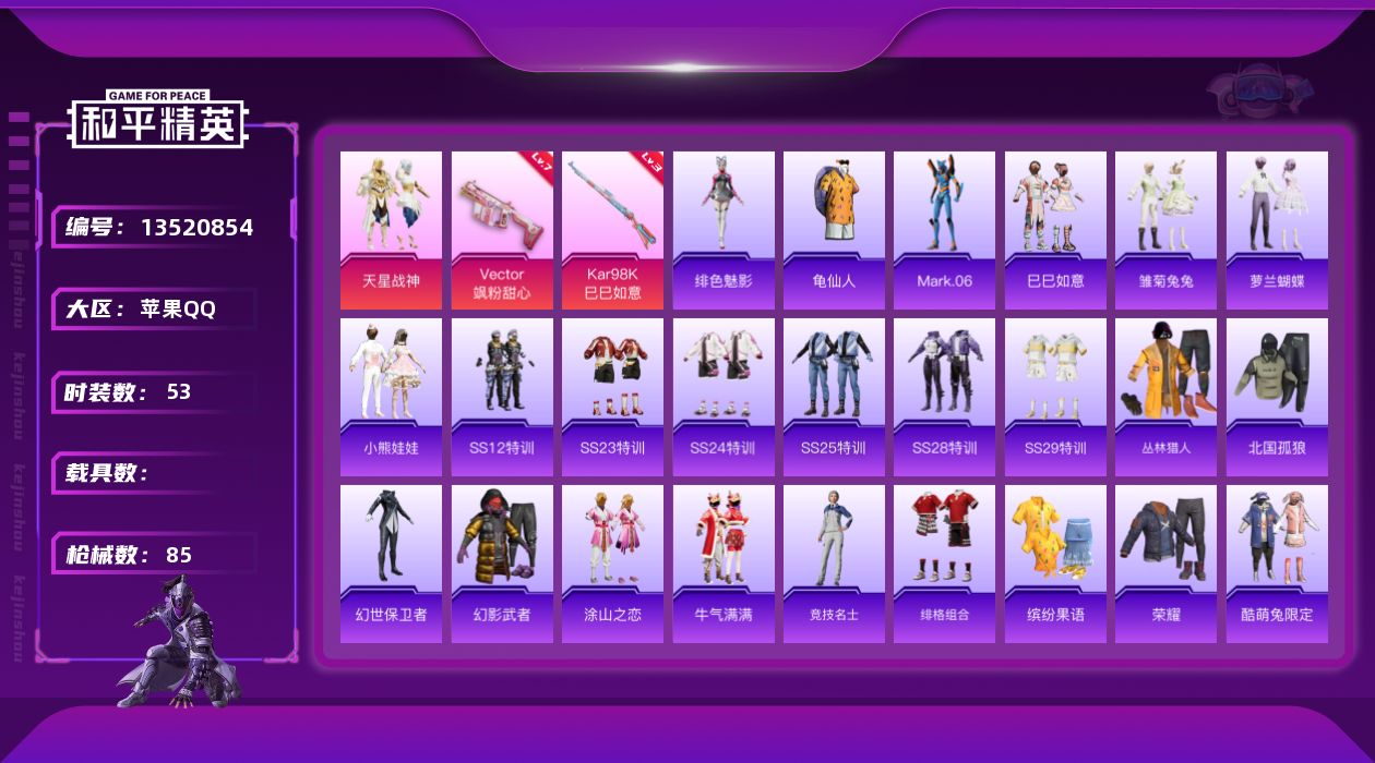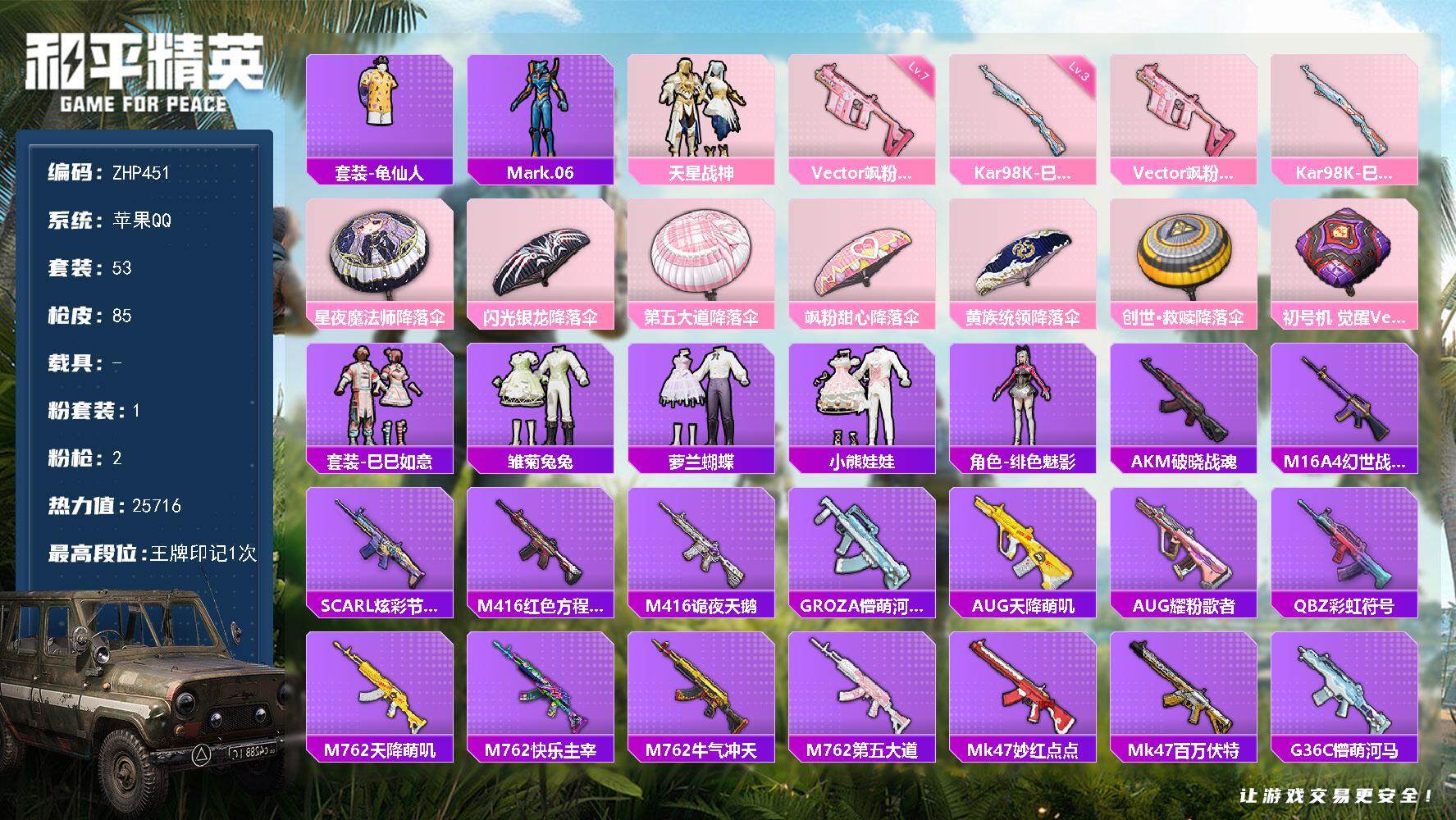 [13520854]可二次【店主推荐捡漏号!可直接换绑】苹果 手Q-1粉装-2特效枪-2.5w热力值-1王牌印记-53套装-85枪皮【热门品类】:套装-龟仙人,角色-Mark.06【粉色套装】:粉装-天星战神【粉色枪皮等级】:Vector-飒粉甜心(七级),Kar98K-巳巳如意(三级)