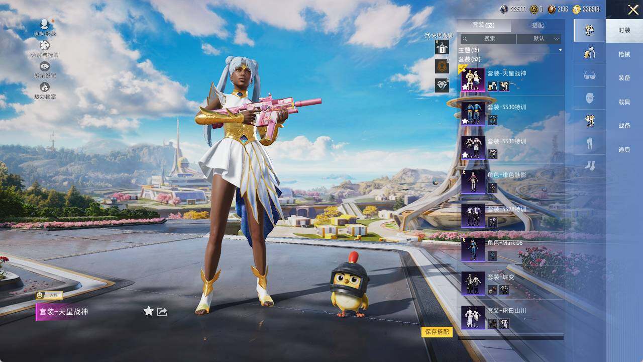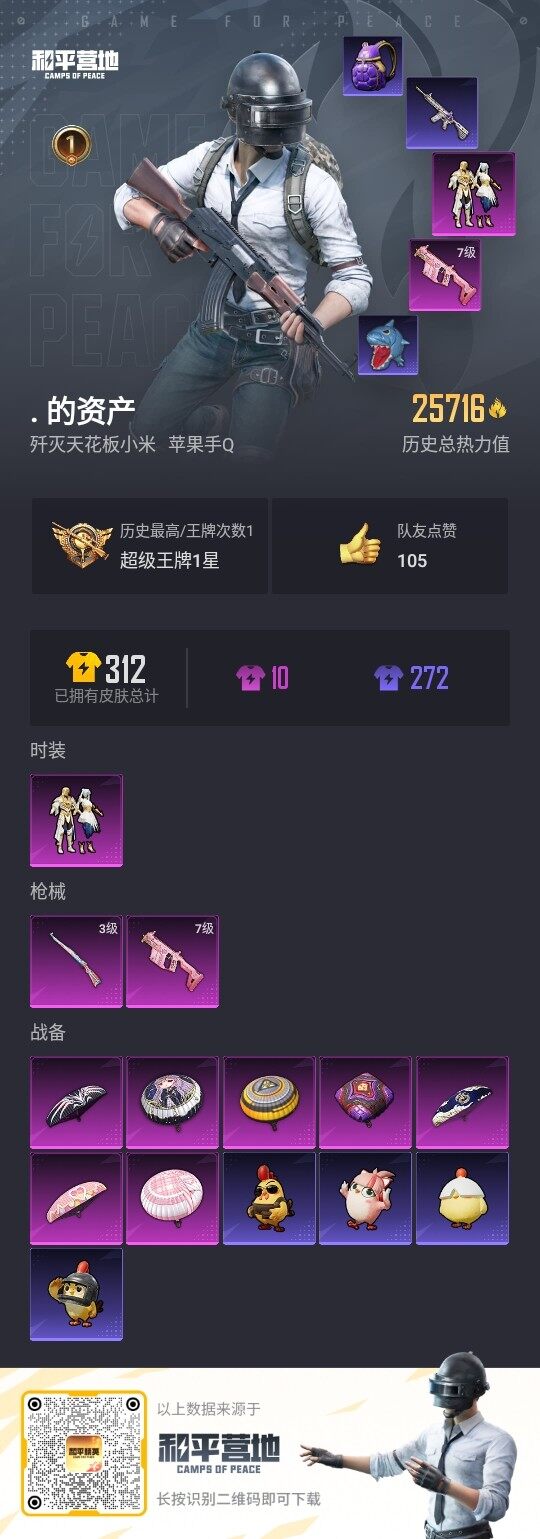 - PX_2095186-时装数: 233 载具数: 2 枪械数: 309 战备数: 199 神级装扮: 金蛇镇世-烛九(一级)热门装扮: 奇异狩猎者,梦幻火箭(新101),幻影战神,深海小丑鱼,宝贝奶油派,天使彩虹糖,梦魇先生,鹰眼刺客,粉色回忆,都市猎人,炙焰红王,冰霜白皇,童趣迷兔,星之彼岸,洛天依,初号机款机体服,霞光圣骑,寒光使者,垂柳戏鸭,恶魔喵喵,音爆索尼克,呆萌星弥,守护天翼,智耀战神