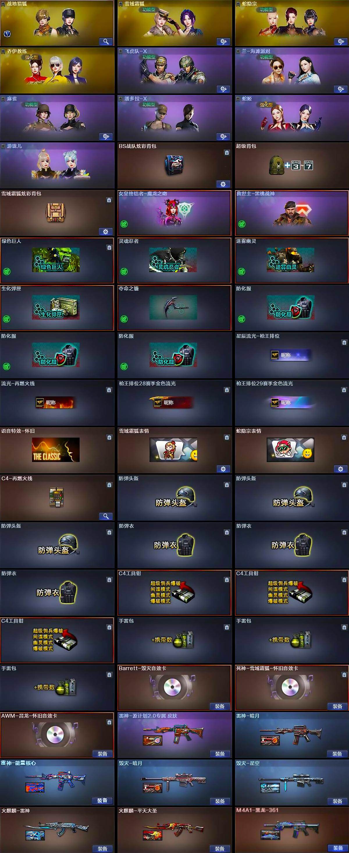 【道具】:BS战队炫彩背包,超级背包,雪域霜狐炫彩背包,女皇终结者-魔龙之吻,救世主-黑桃战神,绿色巨人,灵魂忍者,迷雾幽灵,生化弹匣,夺命之镰,防化服*3,星辰流光-枪王排位,流光-再燃火线,枪王排位28赛季金色流光,枪王排位29赛季金色流光,语音特效-怀旧,雪域霜狐表情,蛇隐宗表情,C4-再燃火线,防弹头盔*3,防弹衣*3,C4工具钳*3,手雷包*3