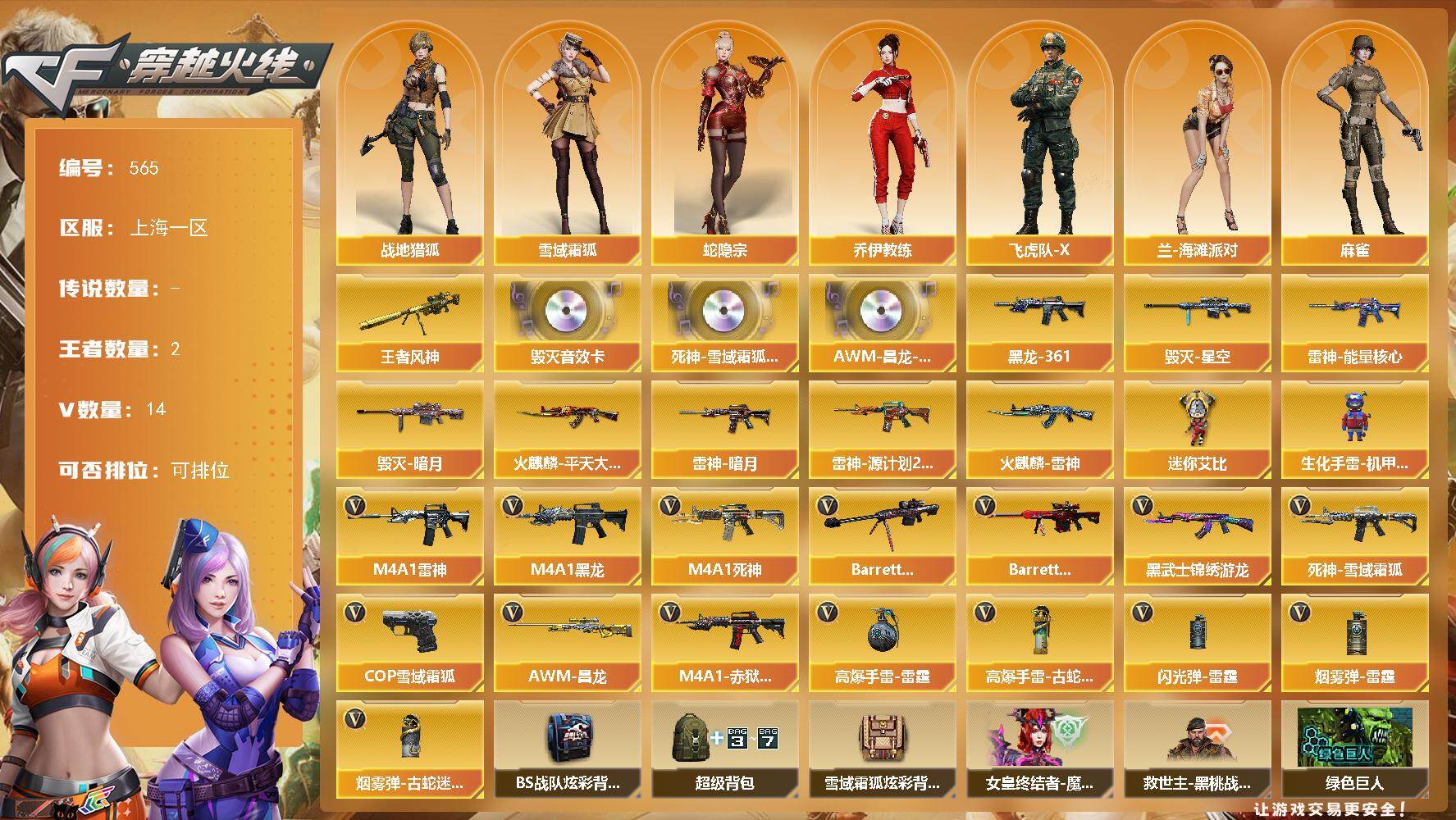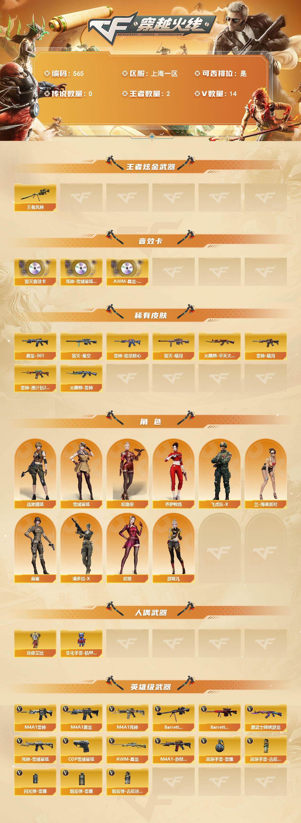 [13524204]上海一区-14V-2王者-0炫金 【王者炫金武器】:王者风神 【音效卡】:Barrett-毁灭音效卡,死神-雪域霜狐-怀旧音效卡,AWM-昌龙-怀旧音效卡 【皮肤】:雷神-暗月,雷神-能量核心,雷神-源计划2.0专属 皮肤,火麒麟-雷神,火麒麟-平天大圣,毁灭-暗月,毁灭-星空,M4A1-黑龙-361 【角色】:战地猎狐,雪域霜狐,蛇隐宗,乔伊教练,飞虎队-X,兰-海滩派对,麻雀,潘多拉-X,蛇姬,游珑儿 【人偶武器】:生化手雷-机甲核心,迷你艾比 【英雄级武器】:M4A1-黑龙,M4A1-雷神,M4A1-死神,黑武士-锦绣游龙,死神-雪域霜狐,Barrett-毁灭,Barrett-极光,COP 357-雪域霜狐,高爆手雷-雷霆,高爆手雷-古蛇迷踪,闪光弹-雷霆,烟雾弹-雷霆,烟雾弹-古蛇迷踪,M4A1-赤狱骑士,AWM-昌龙*2 【道具】:BS战队炫彩背包,超级背包,雪域霜狐炫彩背包,女皇终结者-魔龙之吻,救世主-黑桃战神,绿色巨人,灵魂忍者,迷雾幽灵,生化弹匣,夺命之镰,防化服*3,星辰流光-枪王排位,流光-再燃火线,枪王排位28赛季金色流光,枪王排位29赛季金色流光,语音特效-怀旧,雪域霜狐表情,蛇隐宗表情,C4-再燃火线,防弹头盔*3,防弹衣*3,C4工具钳*3,手雷包*3 【特殊枪械】: