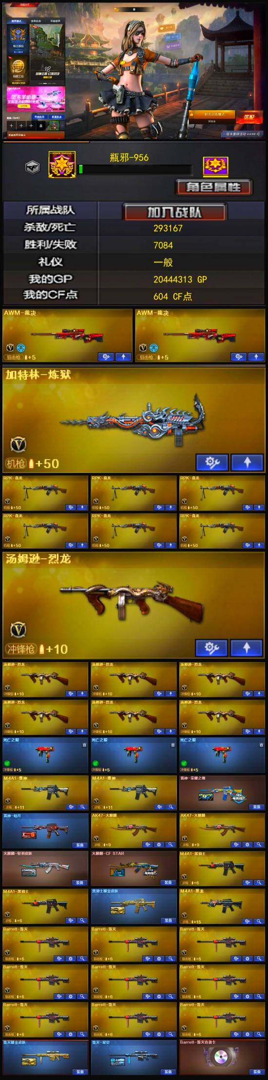 【热门武器】:死亡之眼*3,金色小号,C.A.T*2,M4A1-黑骑士*2,汤姆逊-烈龙*7,RPK-盘龙*6,加特林-炼狱,沙鹰-修罗*5