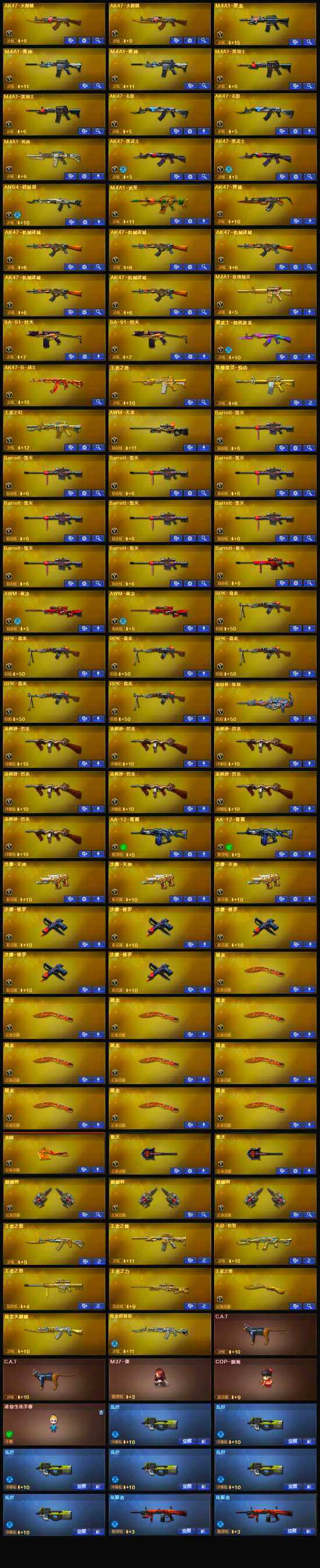 【英雄级武器】:AK47-火麒麟*2,M4A1-黑龙,M4A1-雷神*2,M4A1-黑骑士*2,AK47-无影*2,M4A1-死神,AK47-黑武士*2,AN94-超新星,M4A1-武圣,AK47-机械迷城*5,AK47-黑鲨,黑武士-锦绣游龙,M4A1-玫瑰精灵,王者之势-觉醒版,王者之幻-觉醒版,AK-47-猩红传说,黑武士-CF网剧冠军,AWM-天龙,Barrett-毁灭*9,Barrett-极光,AWM-裁决*2,RPK-盘龙*6,加特林-炼狱,汤姆逊-烈龙*7,AA-12-雷霆*2,沙鹰-修罗*5,沙鹰-天神*3,屠龙*10,龙啸,擎天*2,麒麟刺*3