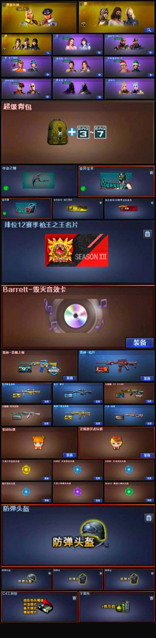 【道具】:战舰背包,炫彩背包,超级背包,变异宝贝,夺命之镰,防化服,金色流光-枪王排位,枪王排位28赛季金色流光,防弹头盔*2,防弹衣*2,C4工具钳,手雷包